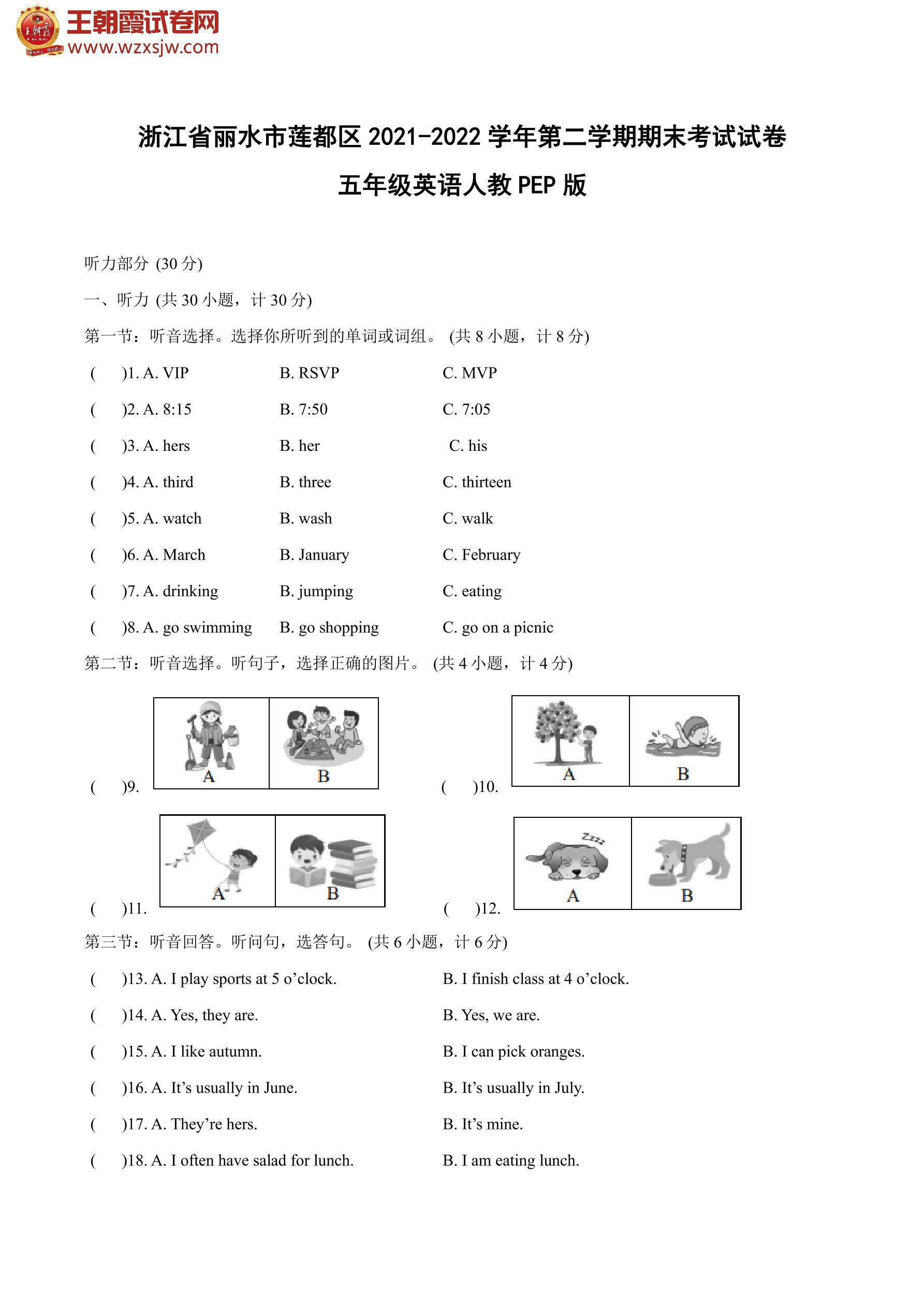 浙江省丽水市莲都区2021-2022学年第二学期期末考试试卷五年级英语(人教PEP版)【无听力音频】