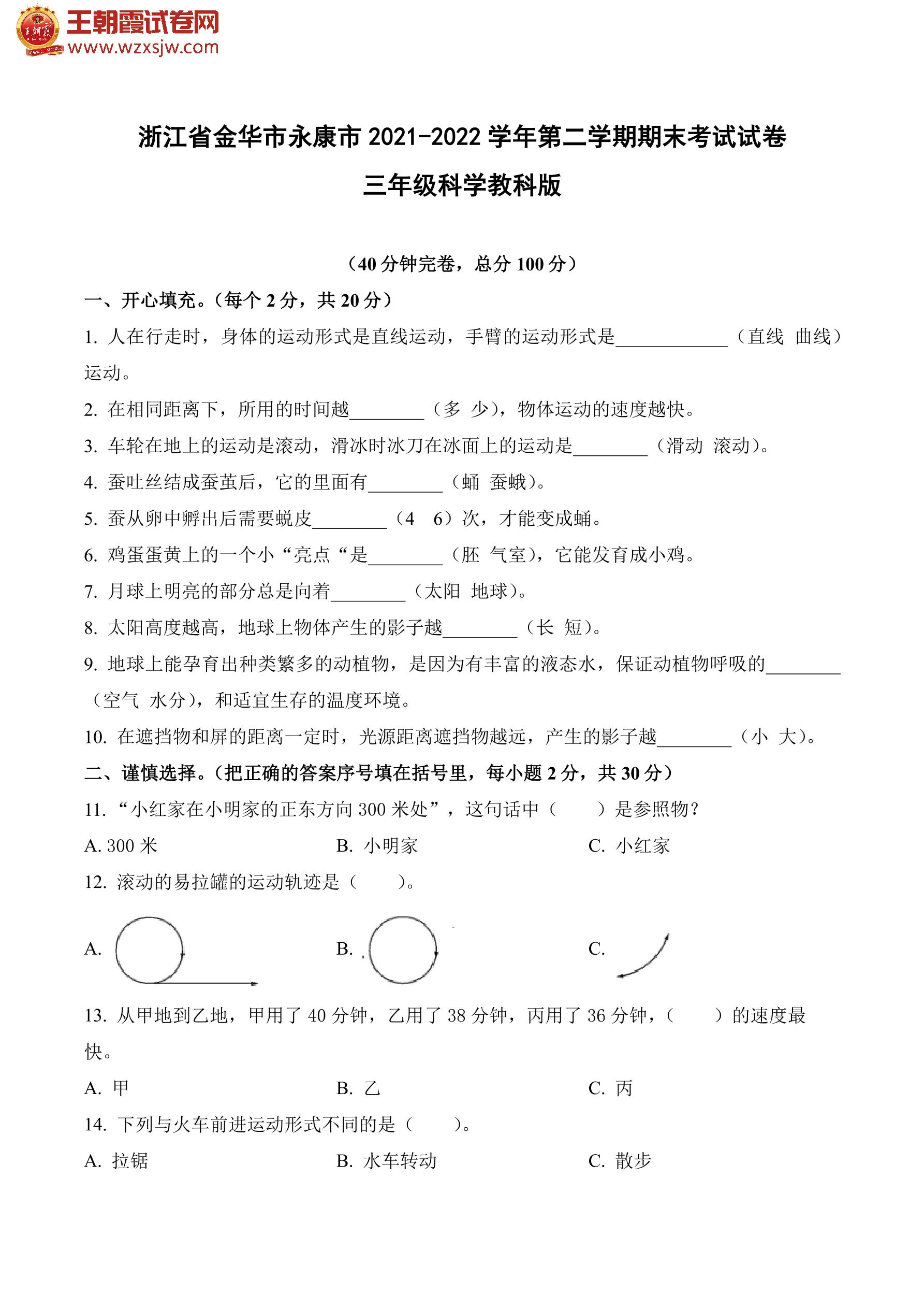 浙江省金华市永康市2021-2022学年第二学期期末考试试卷三年级科学(教科版)