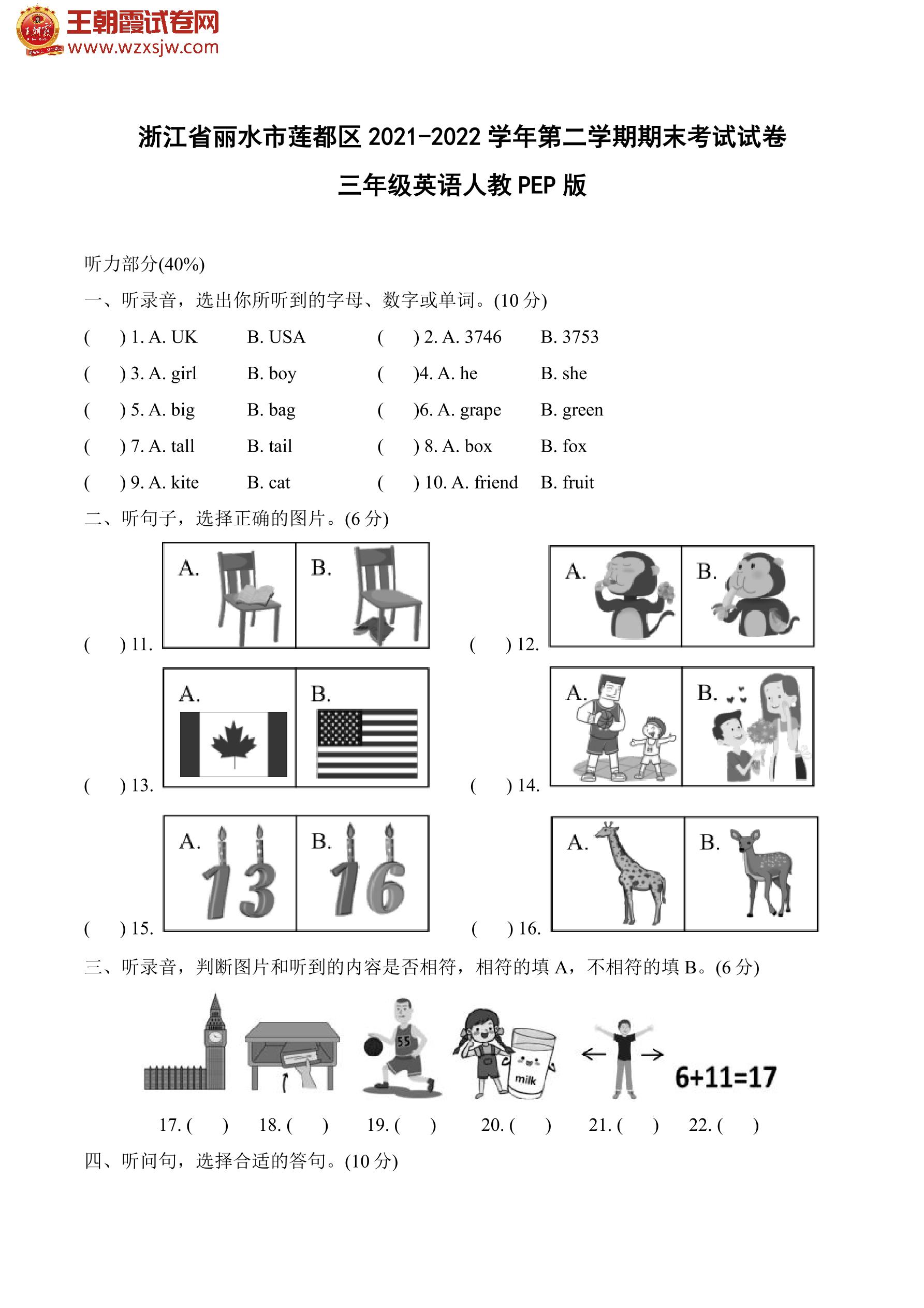 浙江省丽水市莲都区2021-2022学年第二学期期末考试试卷三年级英语(人教PEP版)【无听力音频】