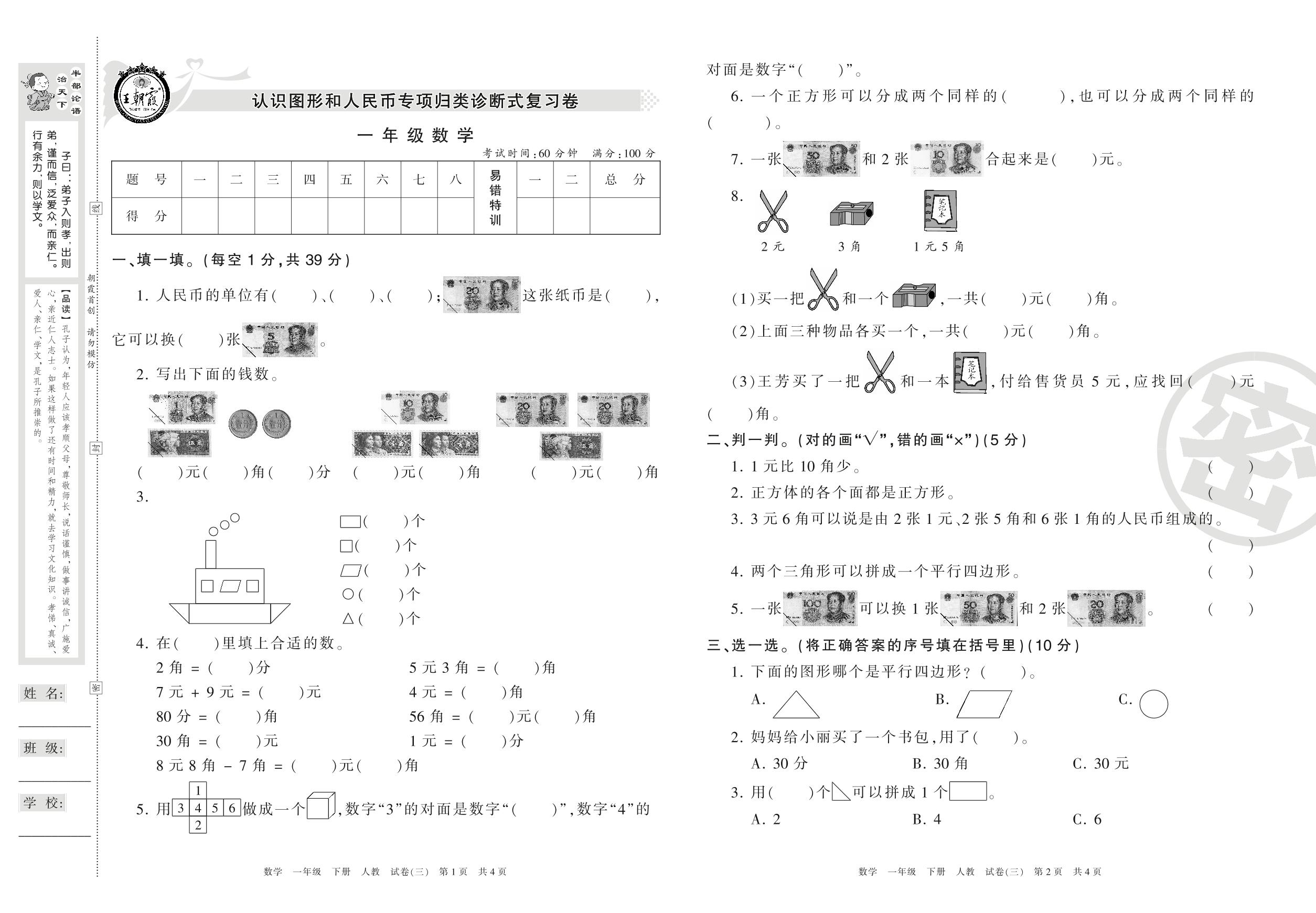 王朝霞期末专项卷一年级下册数学(人教版)_R210802223122【3】