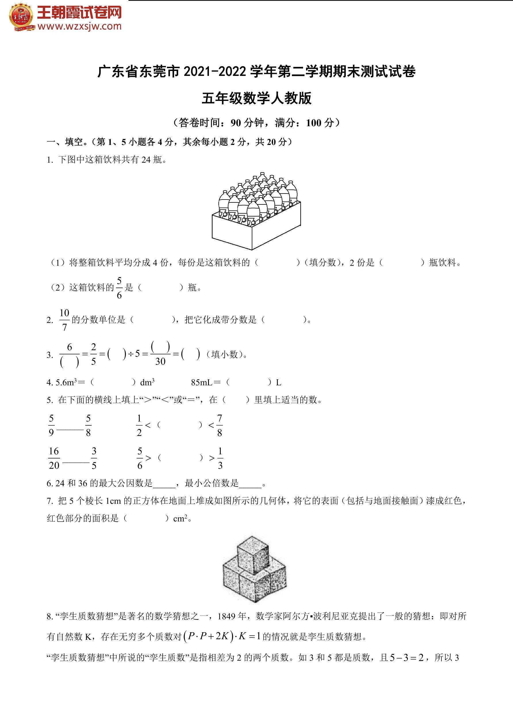 广东省东莞市2021-2022学年第二学期期末测试试卷五年级数学(人教版)