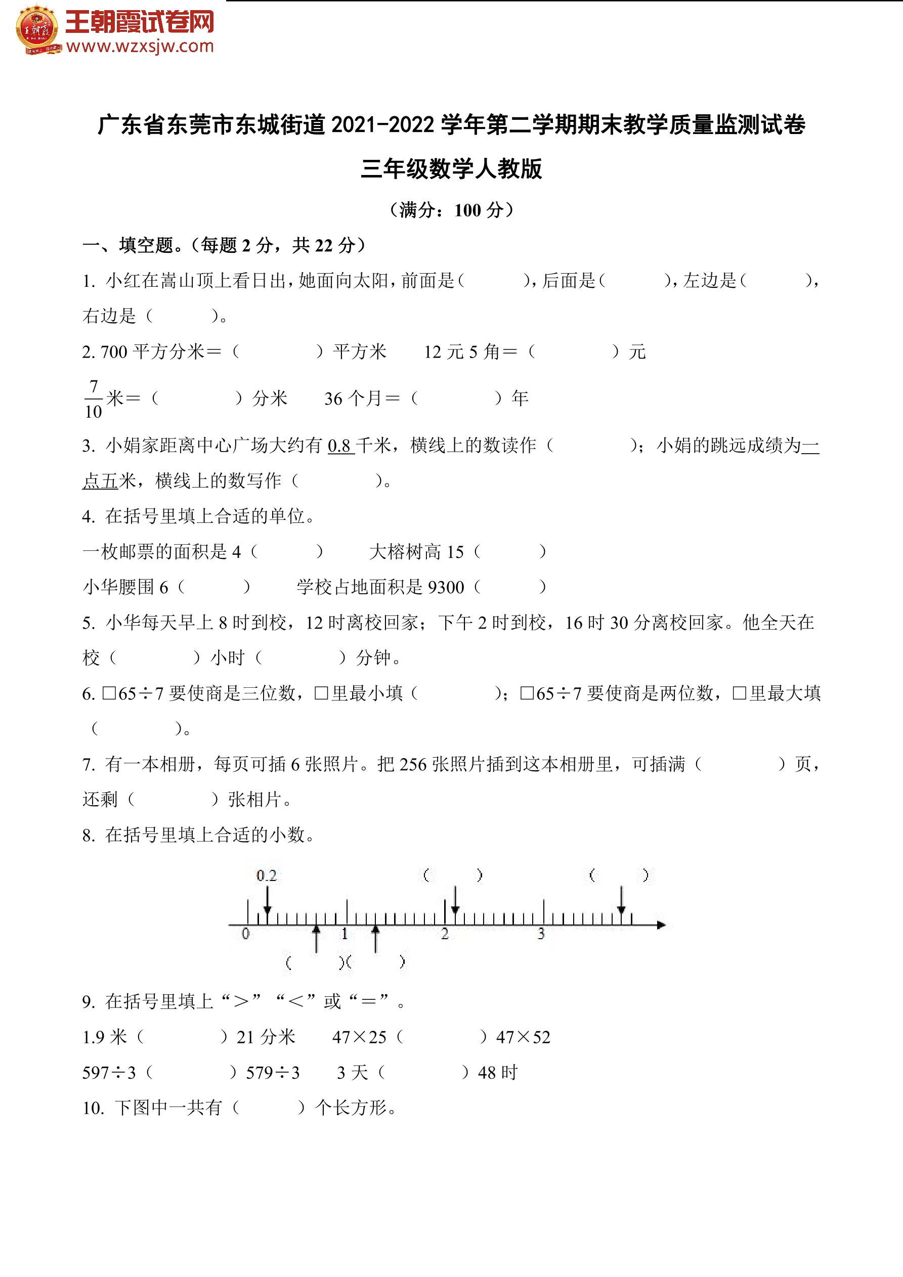 广东省东莞市东城街道2021-2022学年第二学期期末教学质量监测试卷三年级数学(人教版)