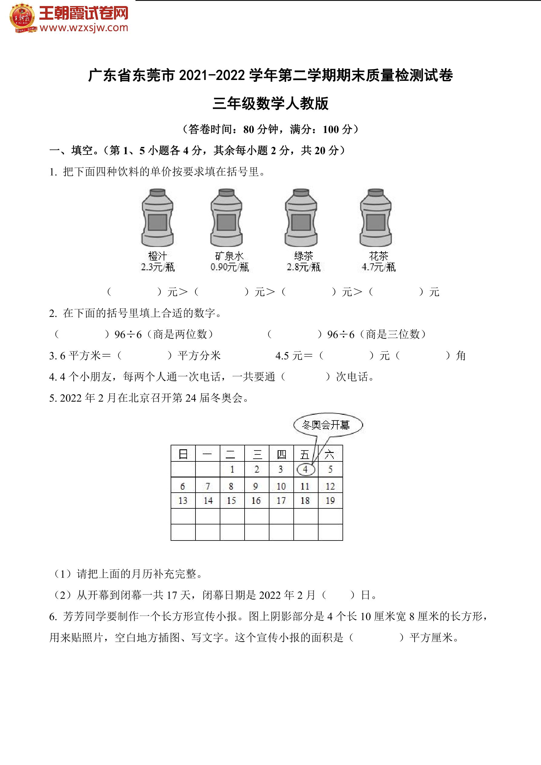 广东省东莞市2021-2022学年第二学期期末质量检测试卷三年级数学(人教版)