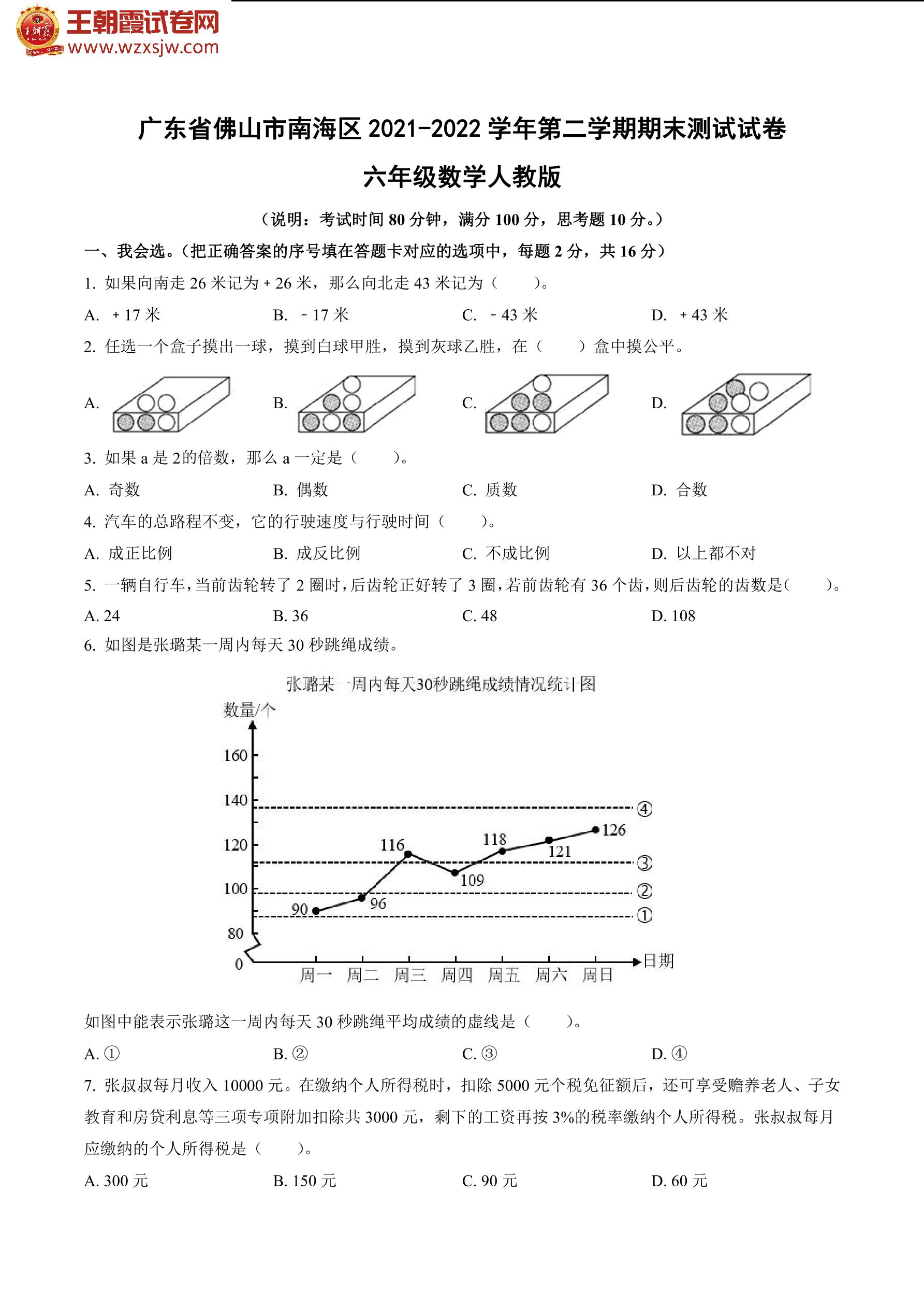 广东省佛山市南海区2021-2022学年第二学期期末测试试卷六年级数学(人教版)