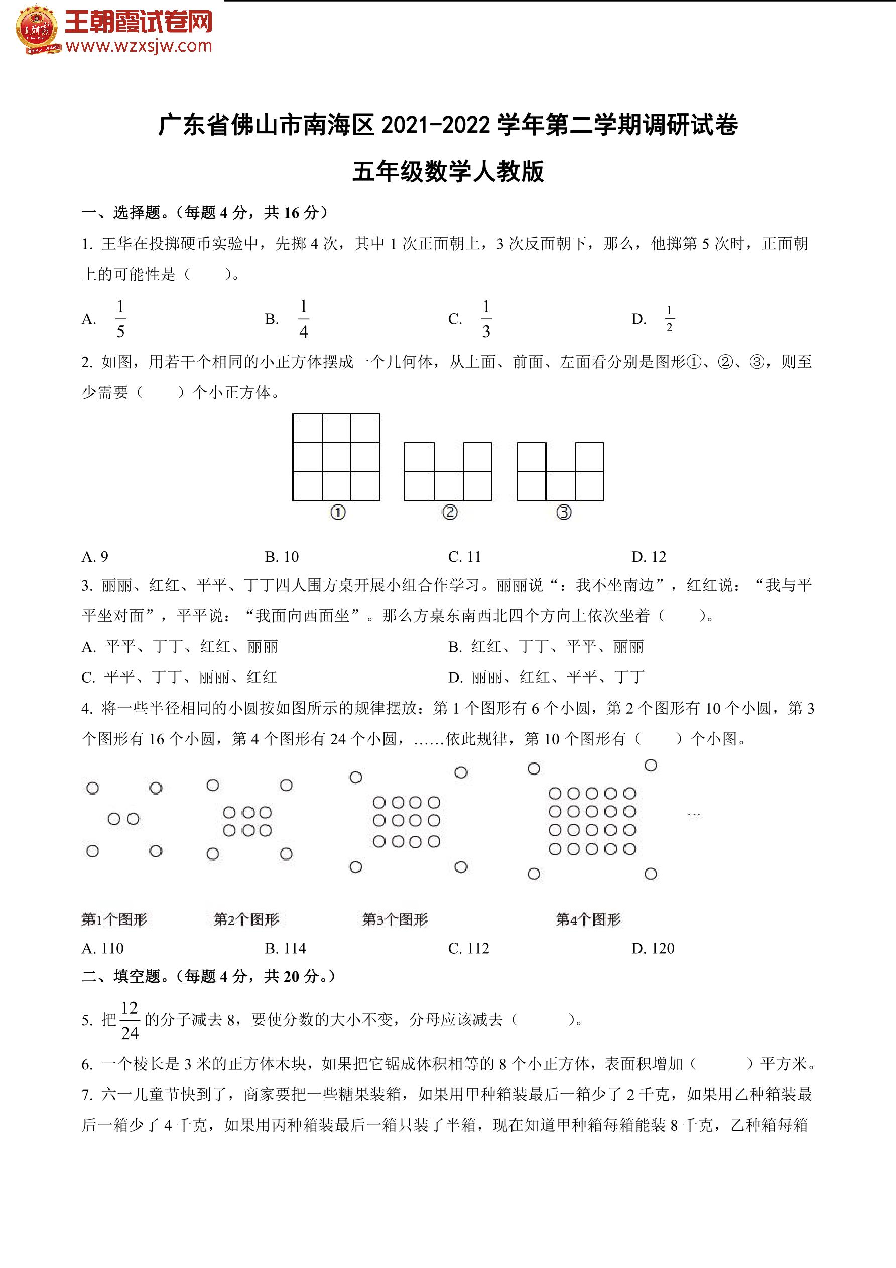 广东省佛山市南海区2021-2022学年第二学期数学调研试卷五年级(人教版)