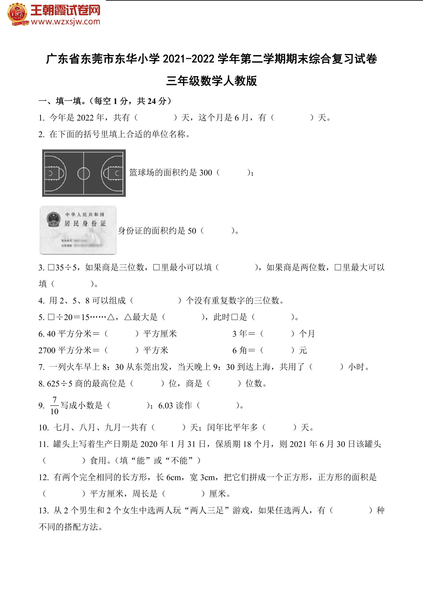 广东省东莞市东华小学2021-2022学年第二学期期末综合复习试卷(一)三年级数学(人教版)
