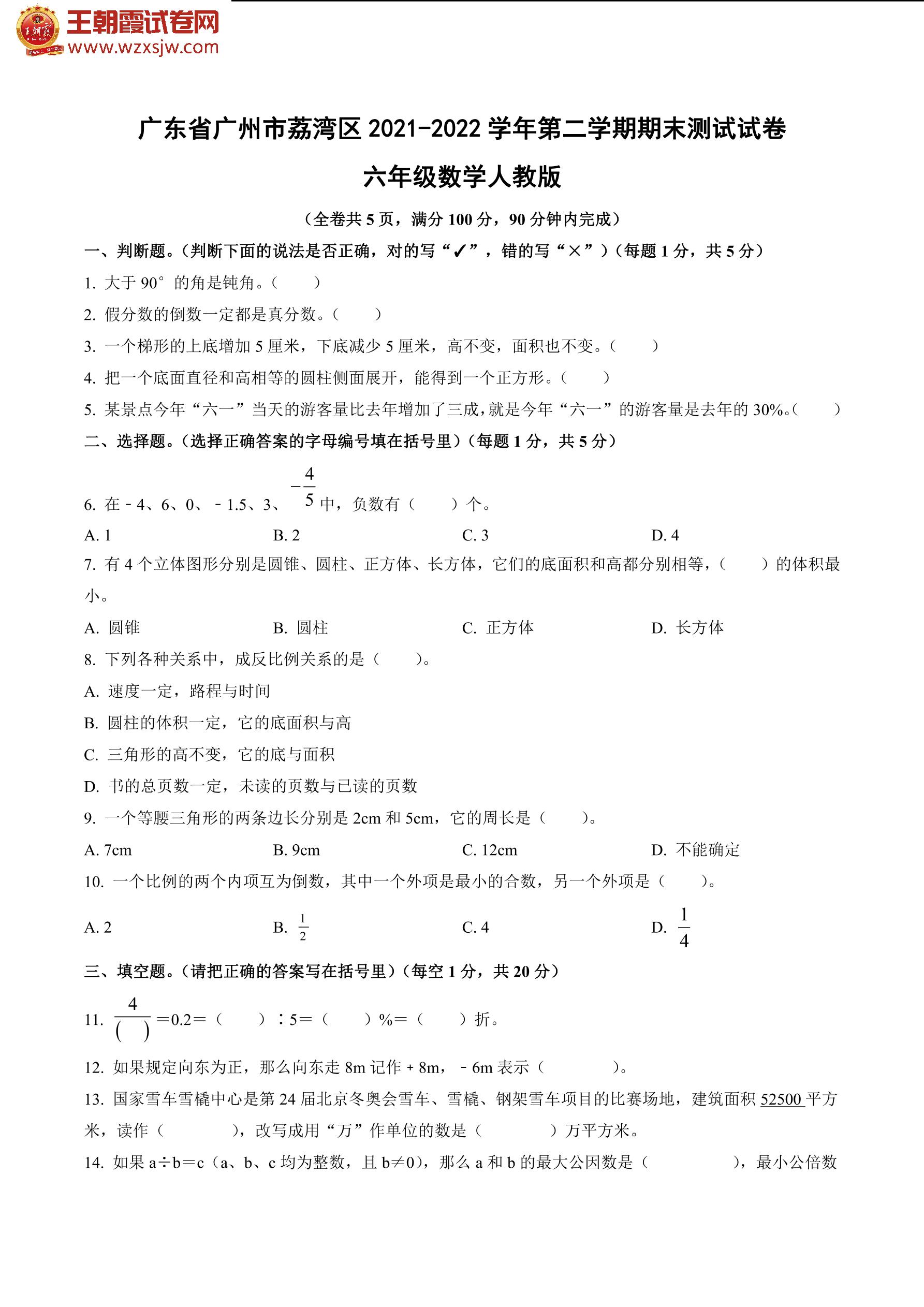 广东省广州市荔湾区2021-2022学年第二学期期末测试试卷六年级数学(人教版)