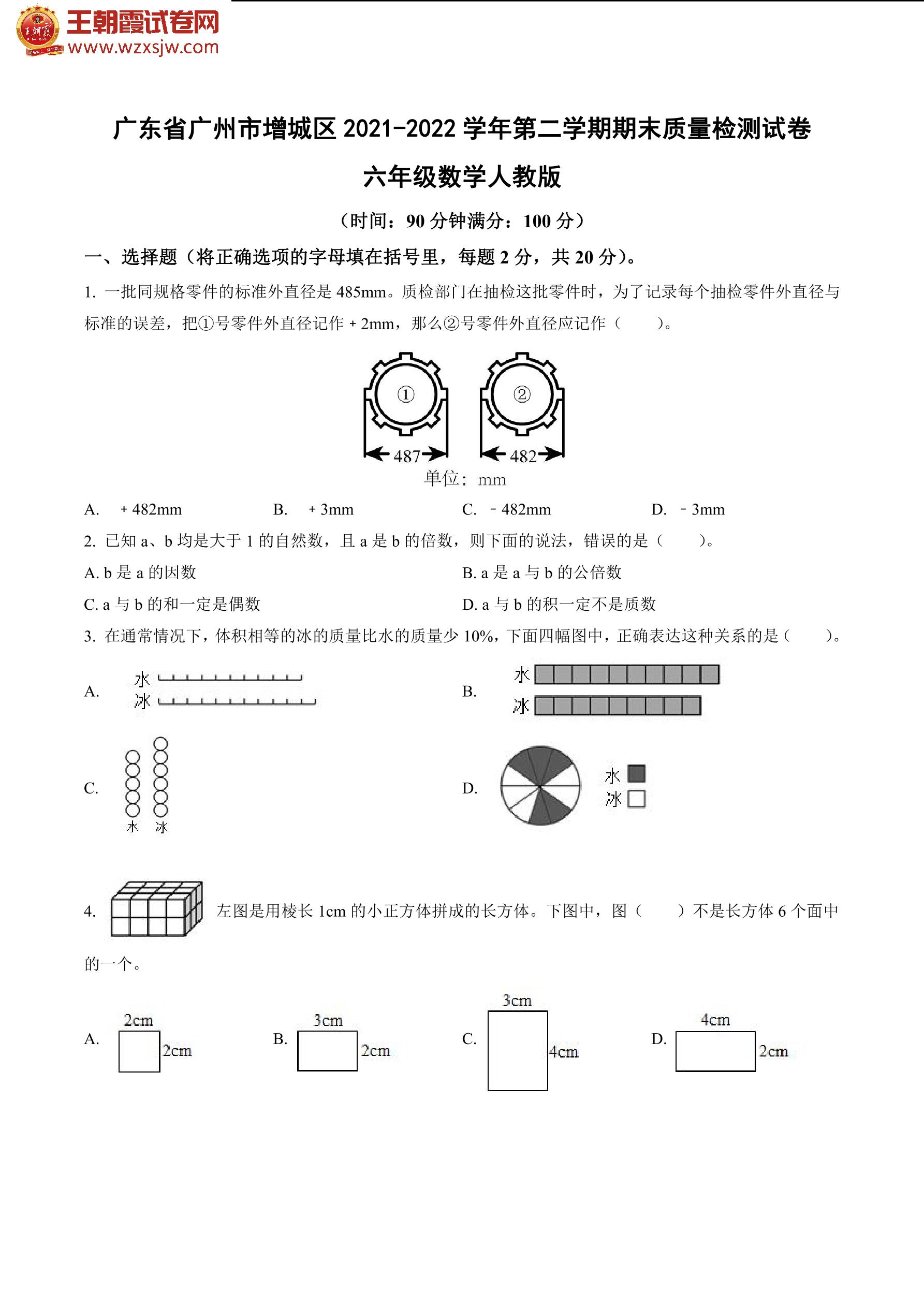 广东省广州市增城区2021-2022学年第二学期期末质量检测试卷六年级数学(人教版)