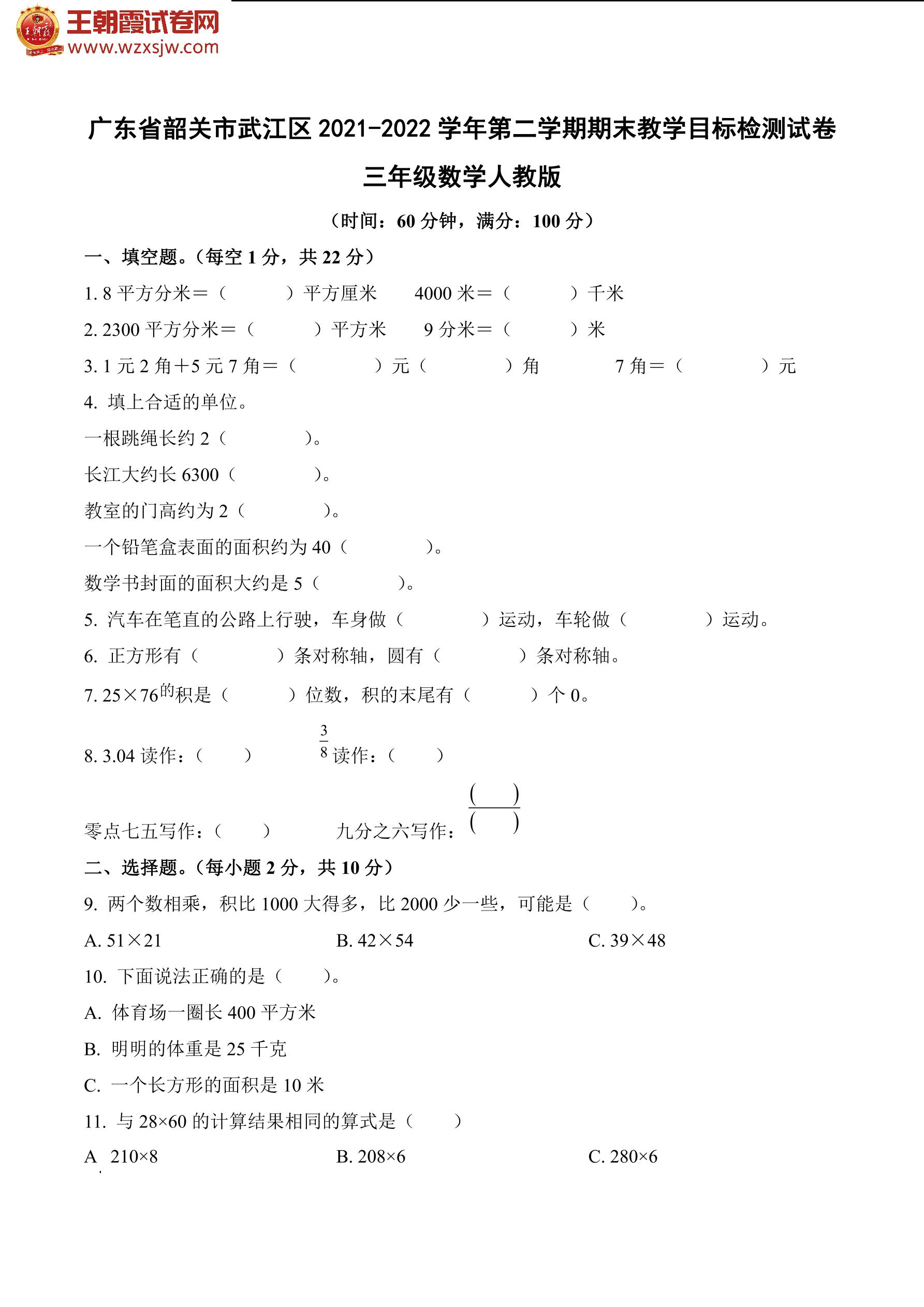 广东省韶关市武江区2021-2022学年第二学期期末教学目标检测试卷三年级数学(人教版)