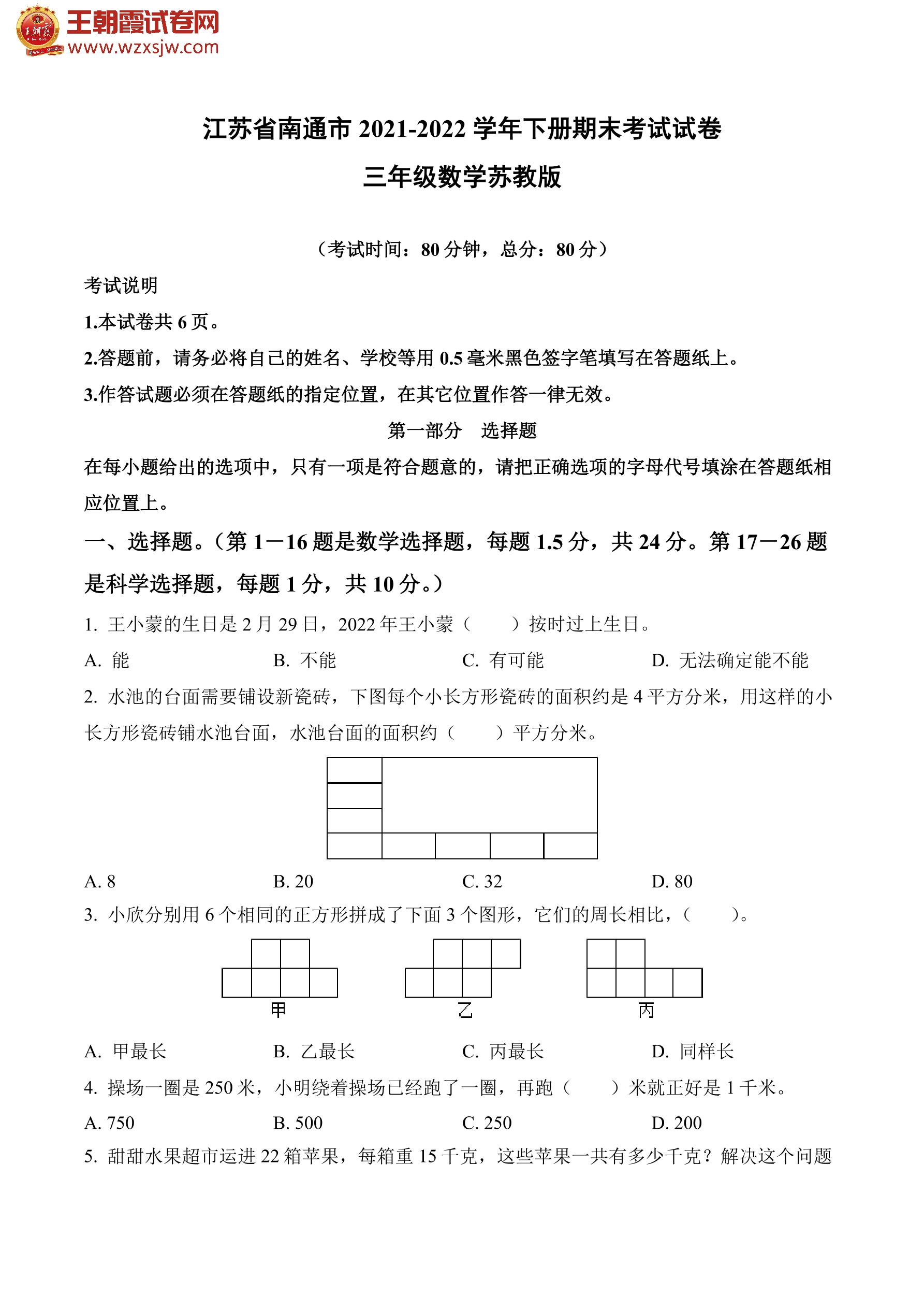 江苏省南通市2021-2022学年下册期末考试试卷三年级数学(苏教版)