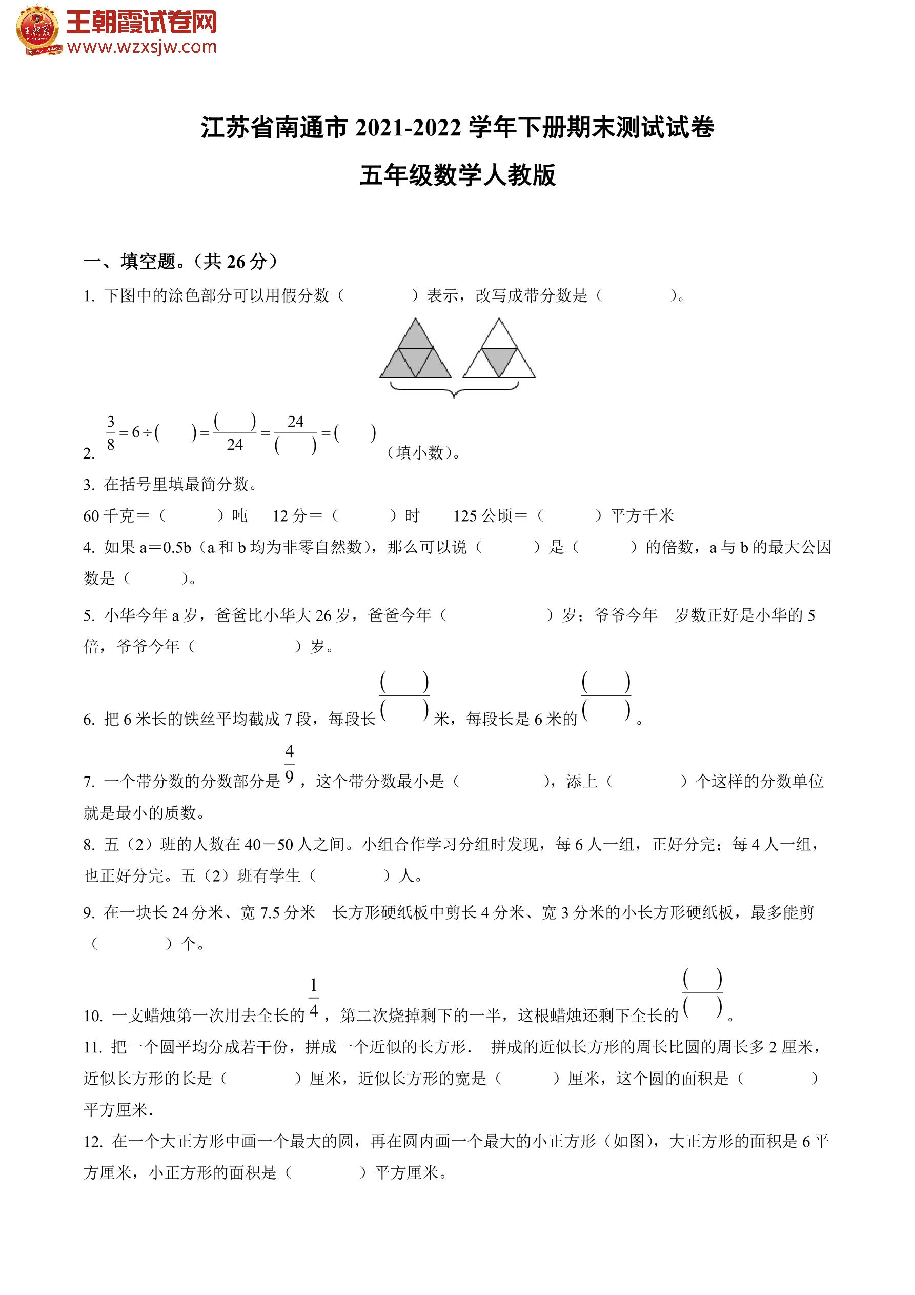 江苏省南通市2021-2022学年下册期末测试试卷五年级数学(人教版)