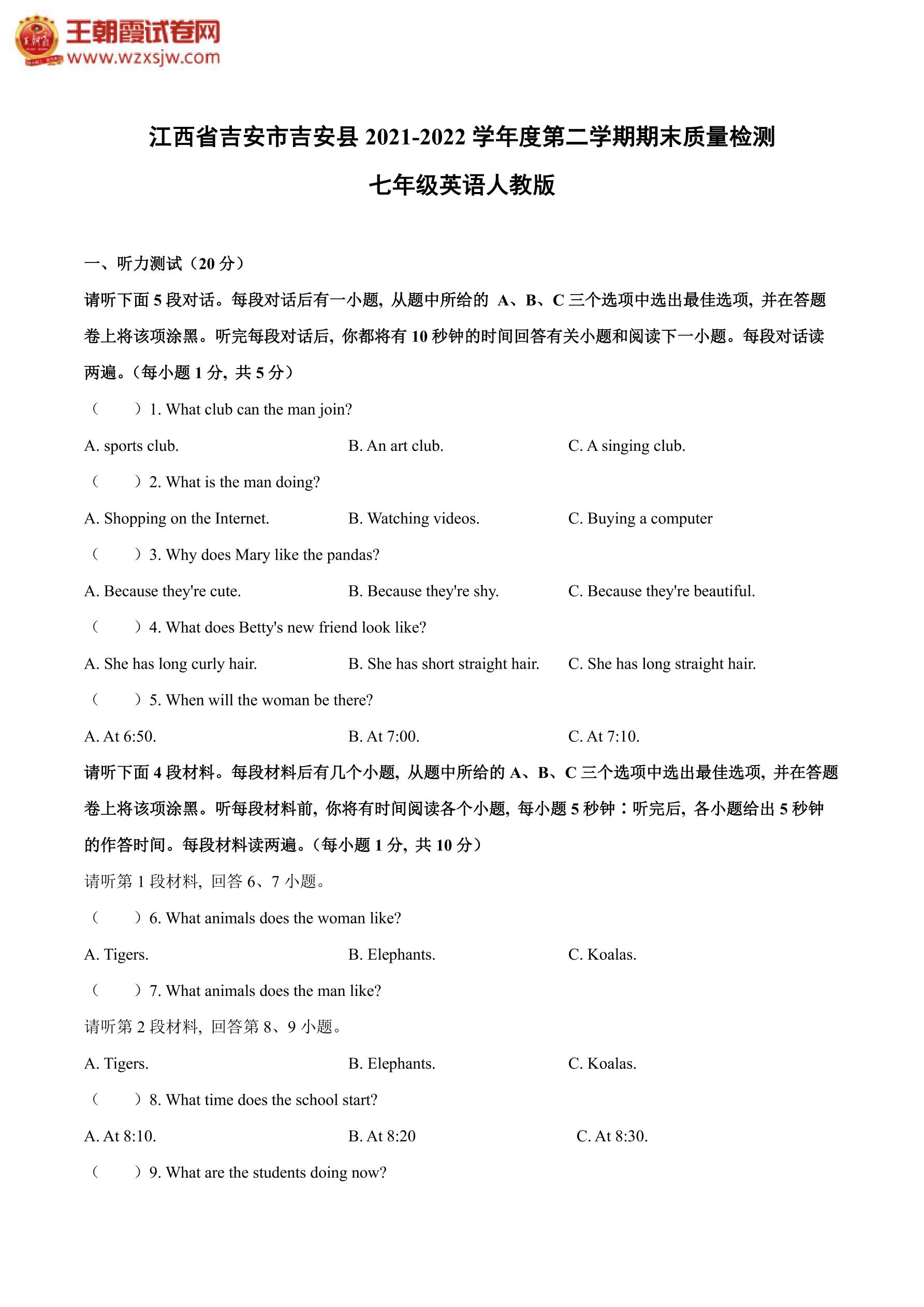 江西省吉安市吉安县2021-2022学年度第二学期期末质量检测七年级英语(人教版)【无听力音频】