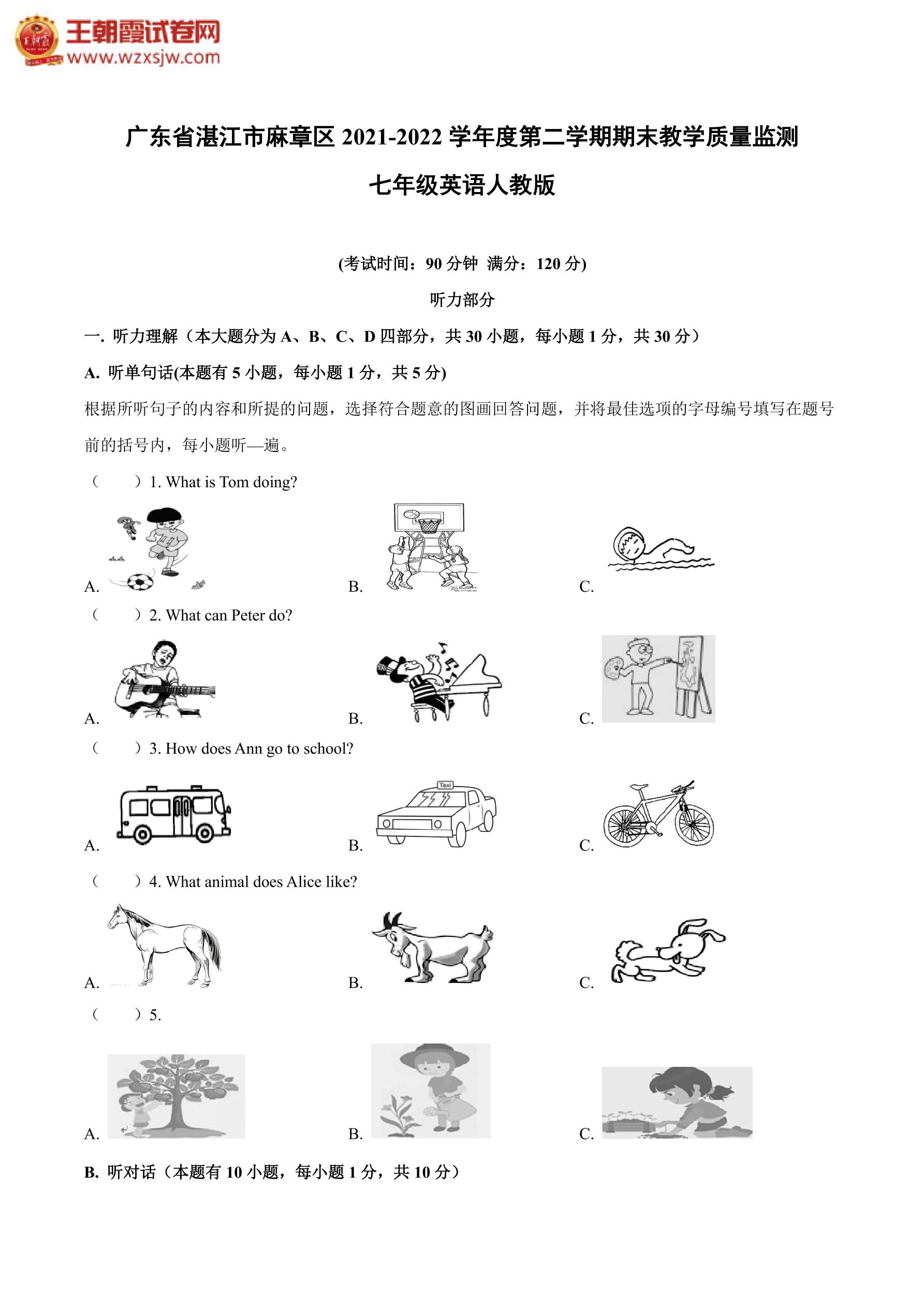 广东省湛江市麻章区2021-2022学年度第二学期期末教学质量监测七年级英语(人教版)【无听力音频】