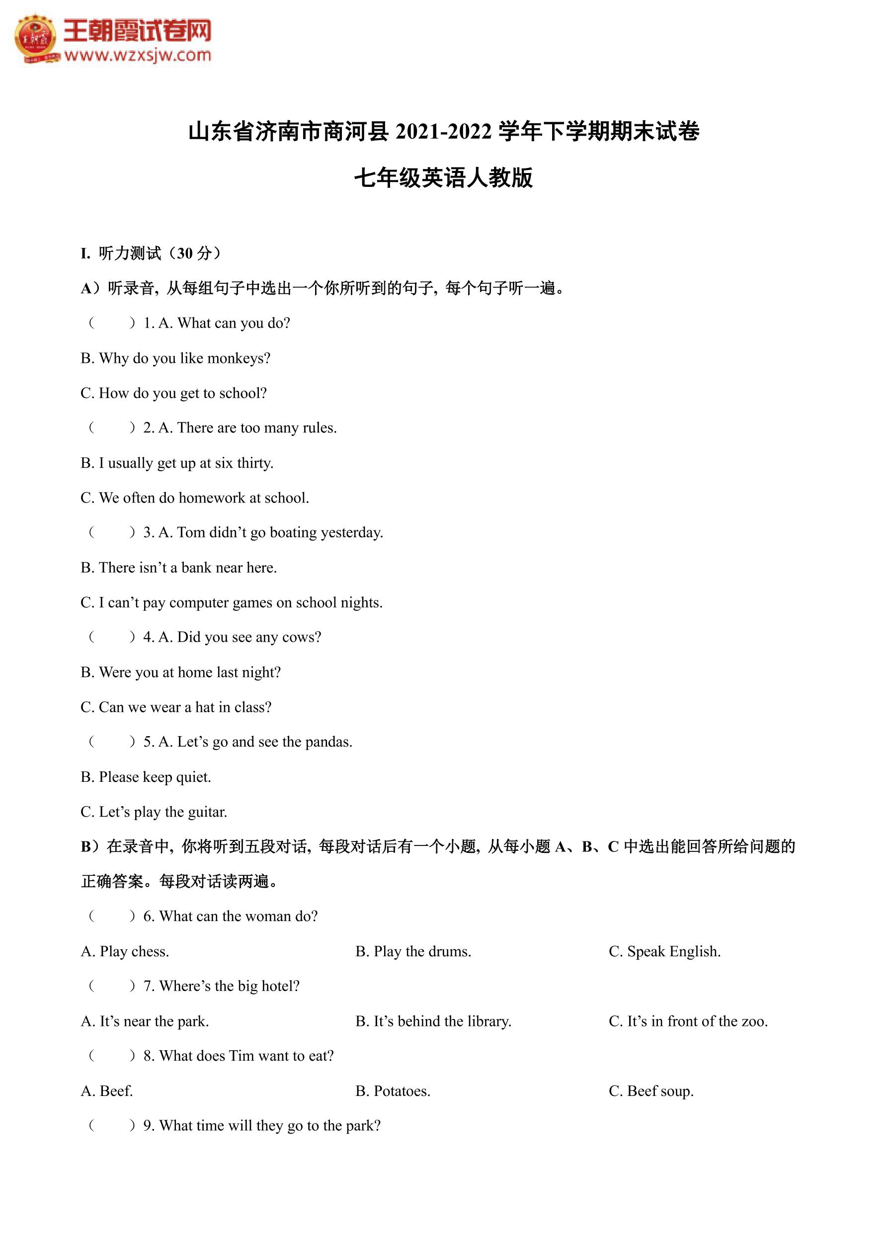 山东省济南市商河县2021-2022学年下学期期末试卷七年级英语(人教版)【无听力音频】