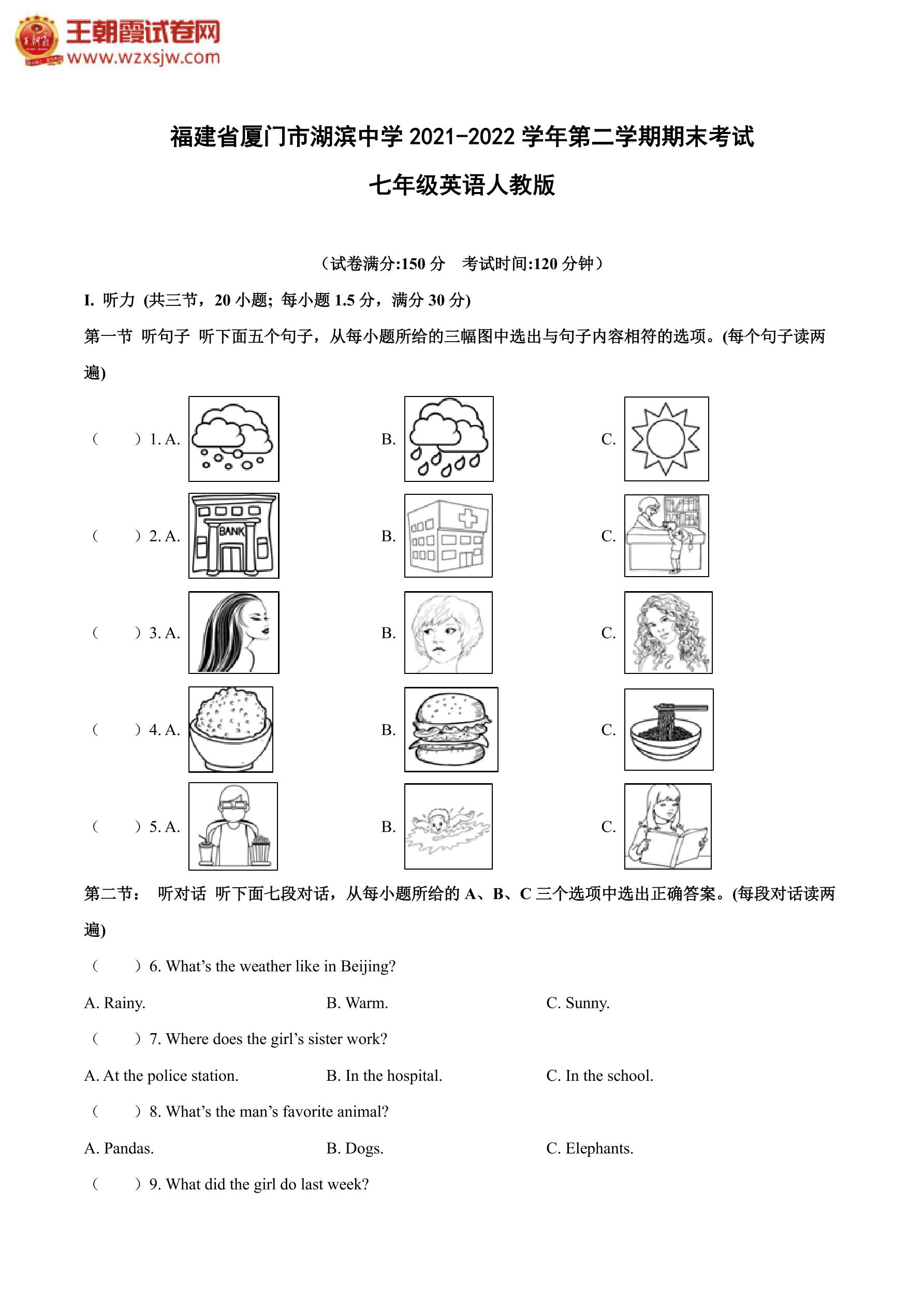福建省厦门市湖滨中学2021-2022学年第二学期期末考试七年级英语(人教版)【无听力音频】