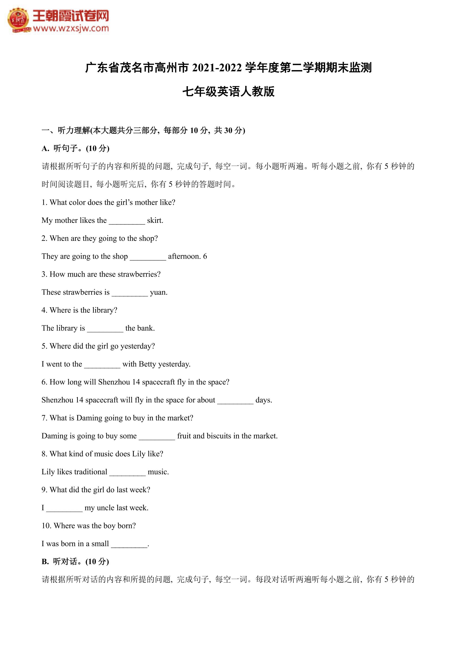 广东省茂名高州市2021-2022学年度第二学期期末监测七年级英语(人教版)【无听力音频】