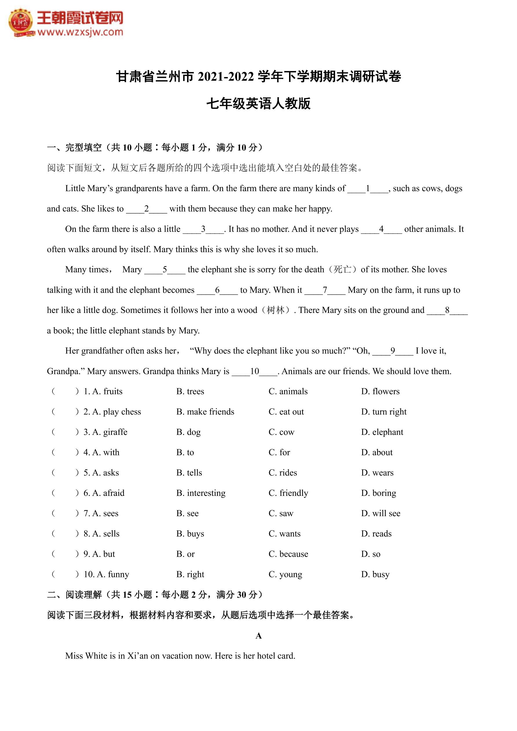 甘肃省兰州市2021-2022学年下学期期末调研试卷七年级英语(人教版)【无听力音频】