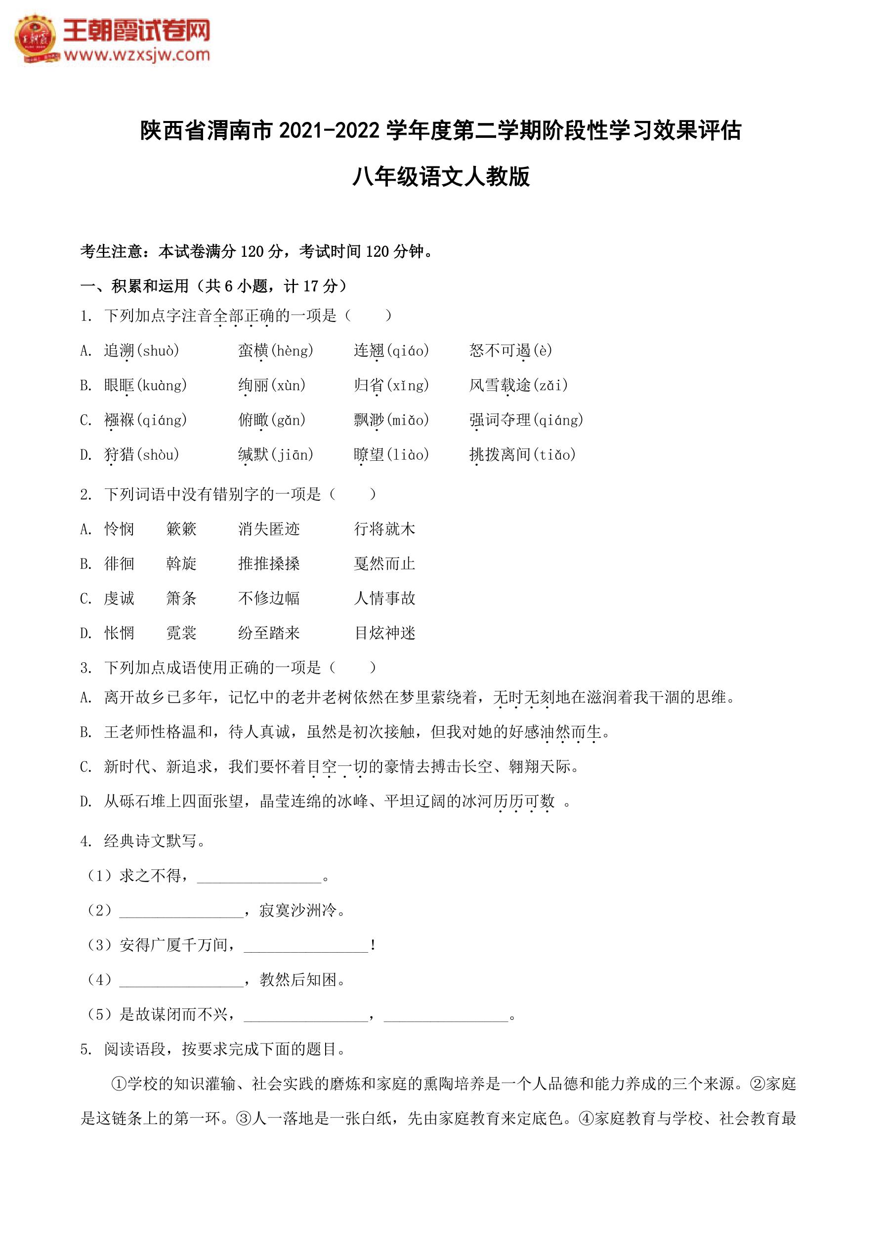 陕西省渭南市2021-2022学年度第二学期阶段性学习效果评估八年级语文(人教版)
