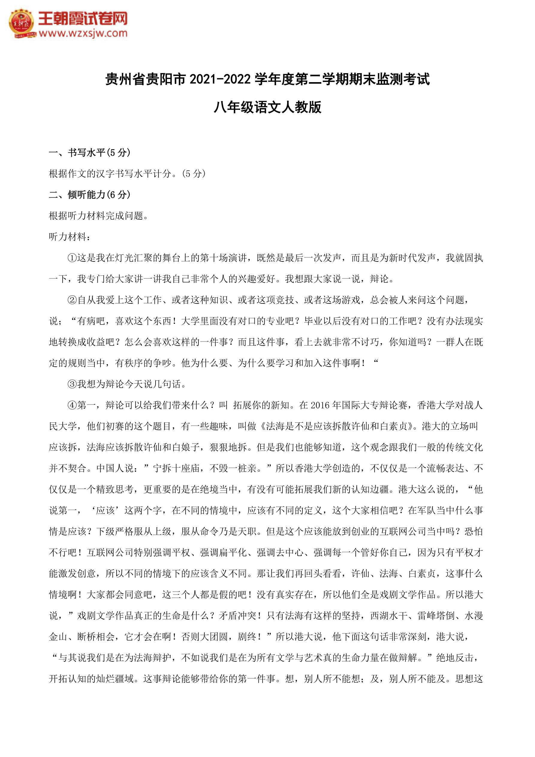 贵州省贵阳市2021-2022学年度第二学期期末监测考试八年级语文(人教版)
