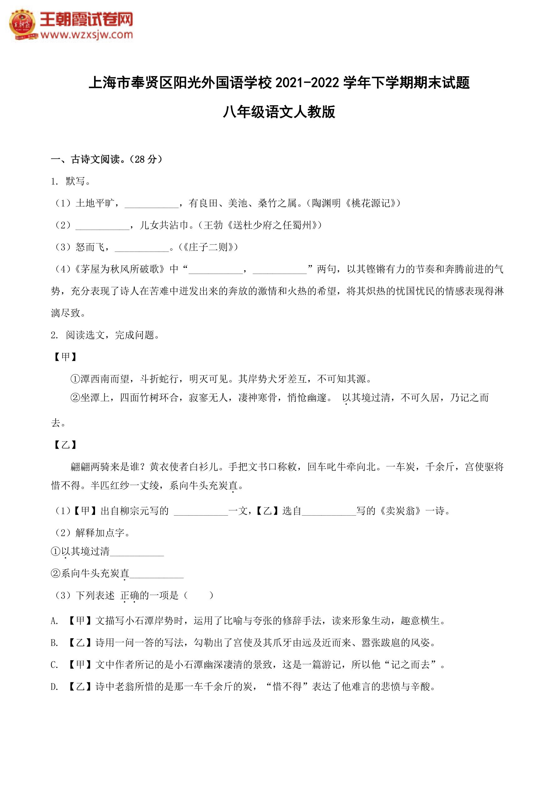 上海市奉贤区阳光外国语学校2021-2022学年下学期期末试题八年级语文(人教版)