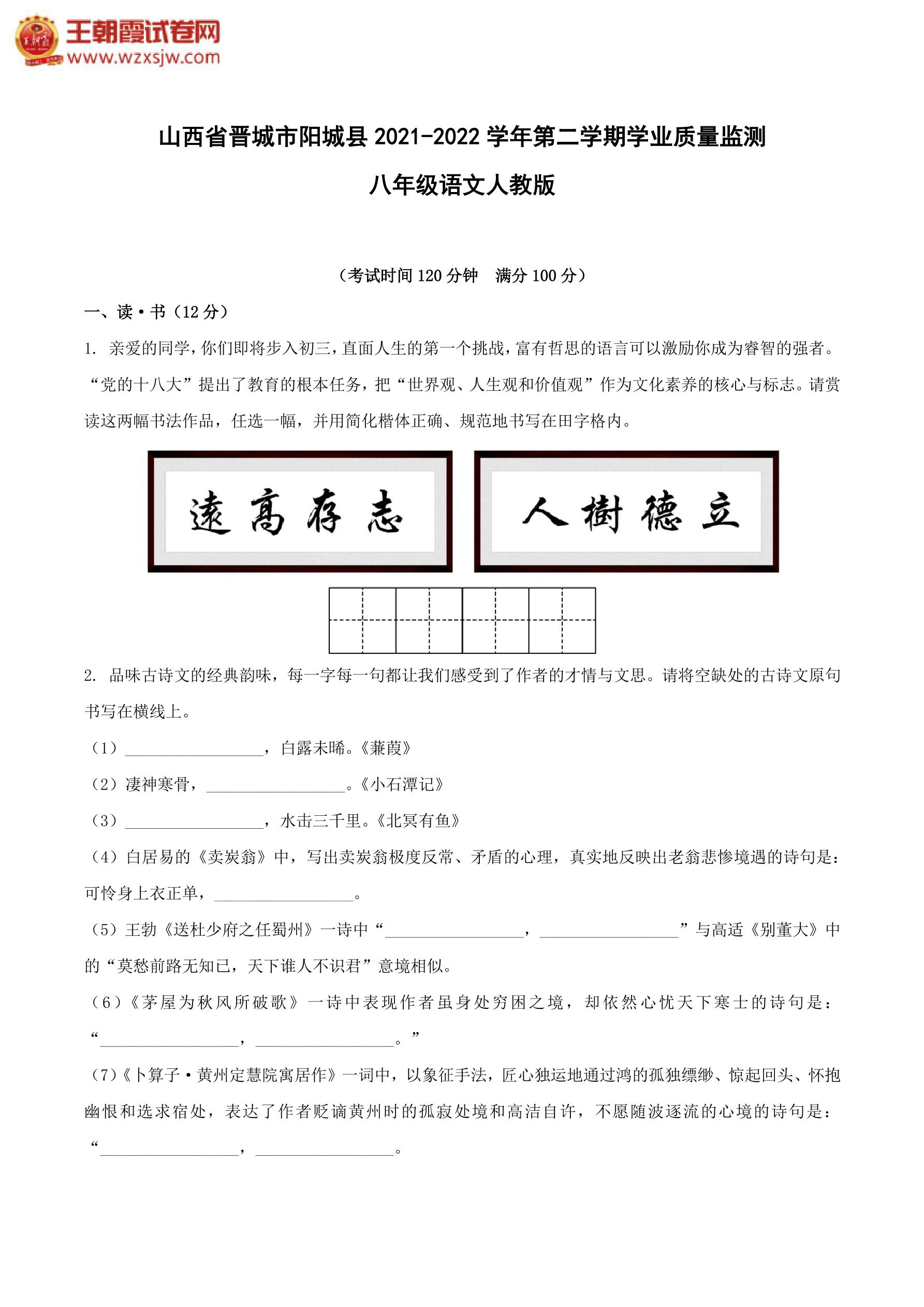 山西省晋城市阳城县2021-2022学年第二学期学业质量监测八年级语文(人教版)