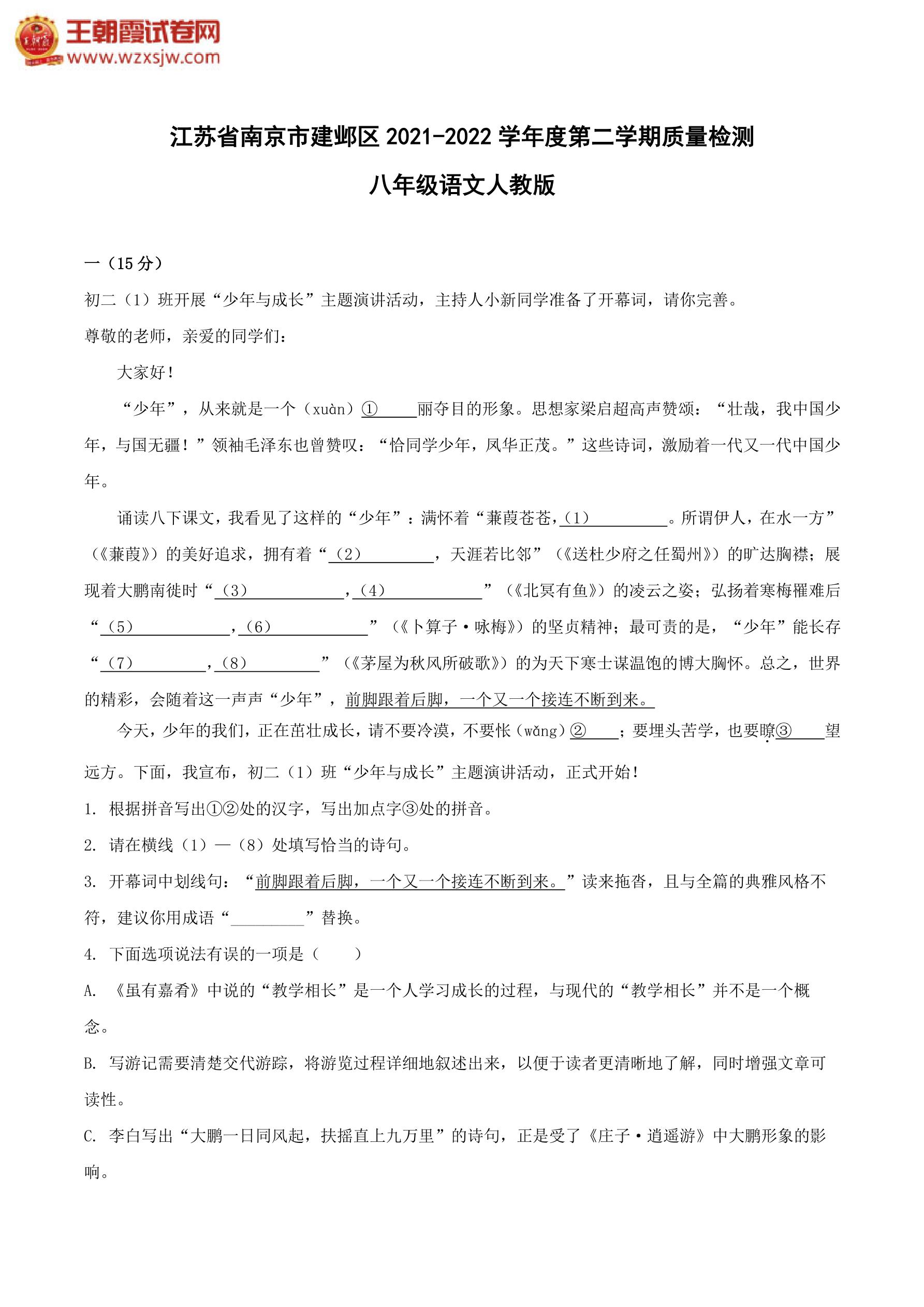 江苏省南京市建邺区2021-2022学年度第二学期期末质量检测八年级语文(人教版)