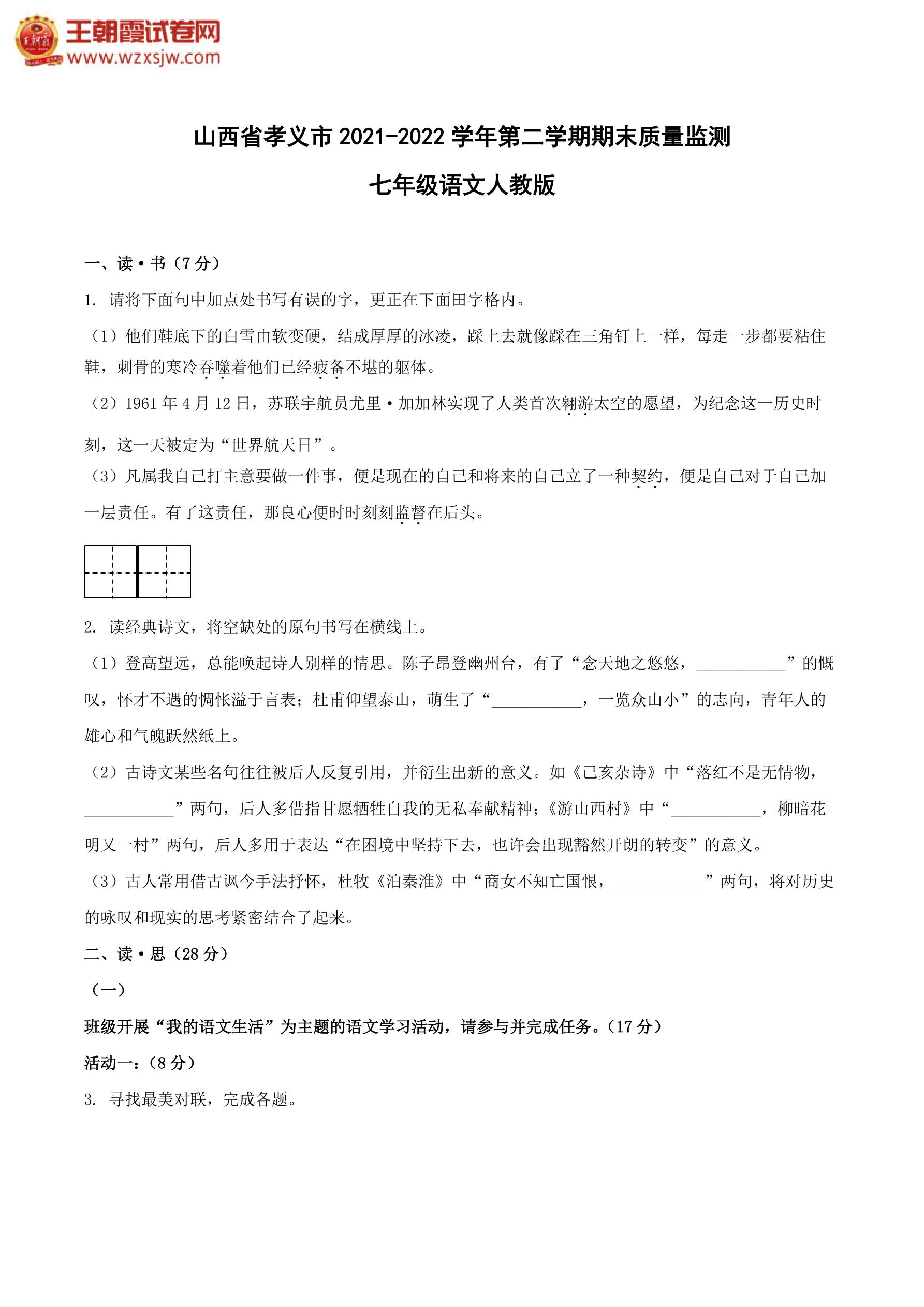 山西省孝义市2021-2022学年第二学期期末质量监测七年级语文(人教版)