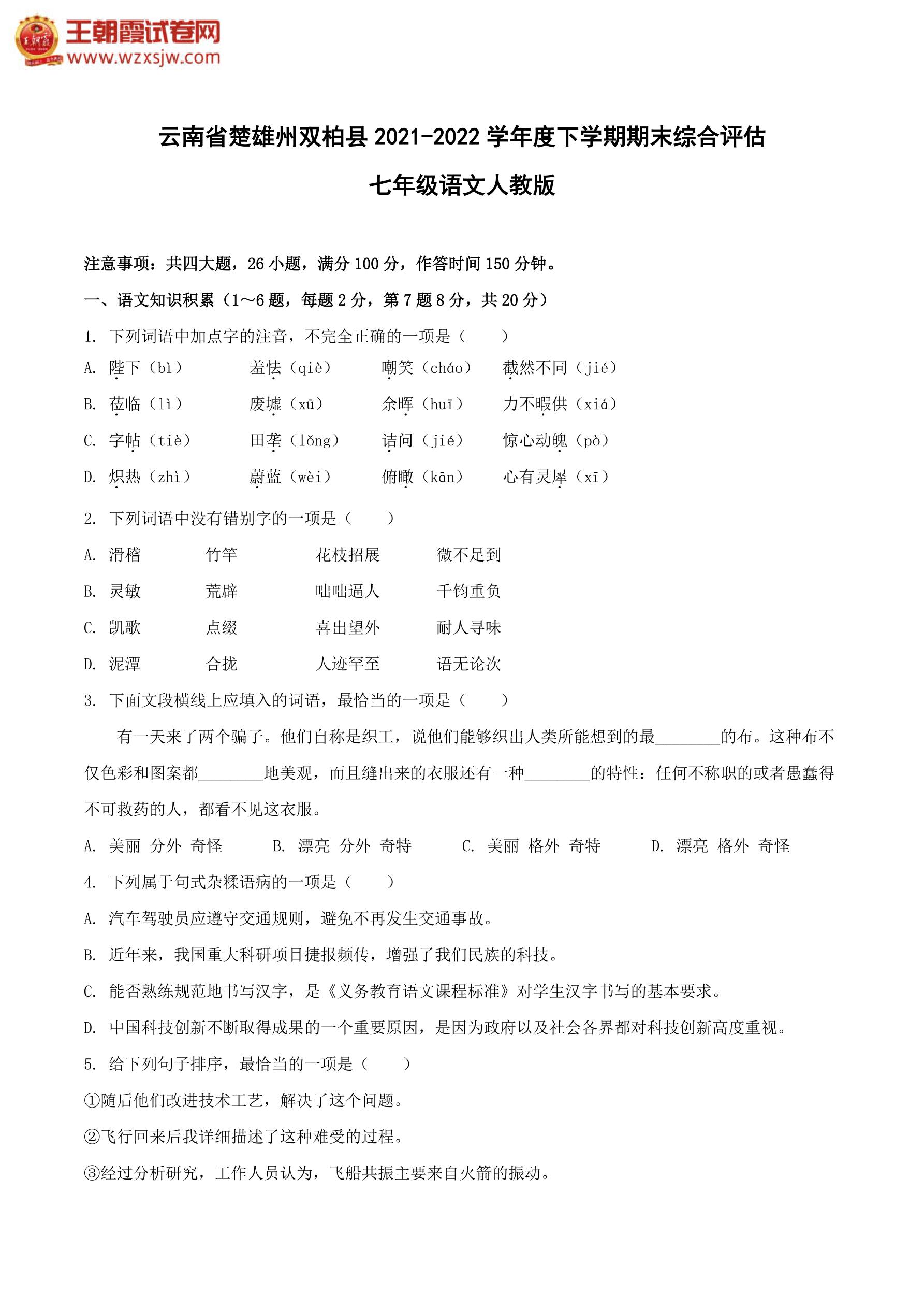 云南省楚雄州双柏县2021-2022学年度下学期期末综合评估七年级语文(人教版)