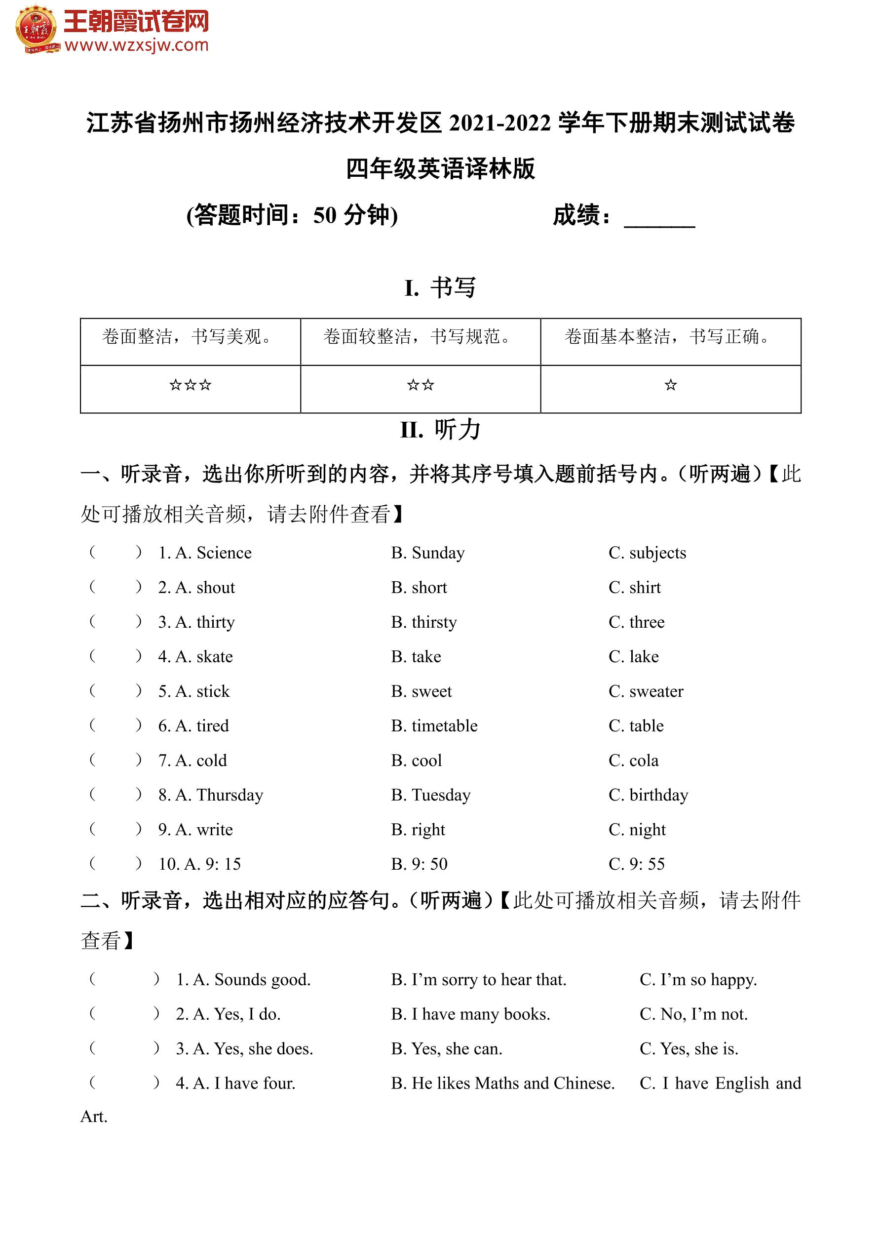 江苏省扬州市扬州经济技术开发区2021-2022学年下册期末测试试卷四年级英语(译林版)【无听力音频】