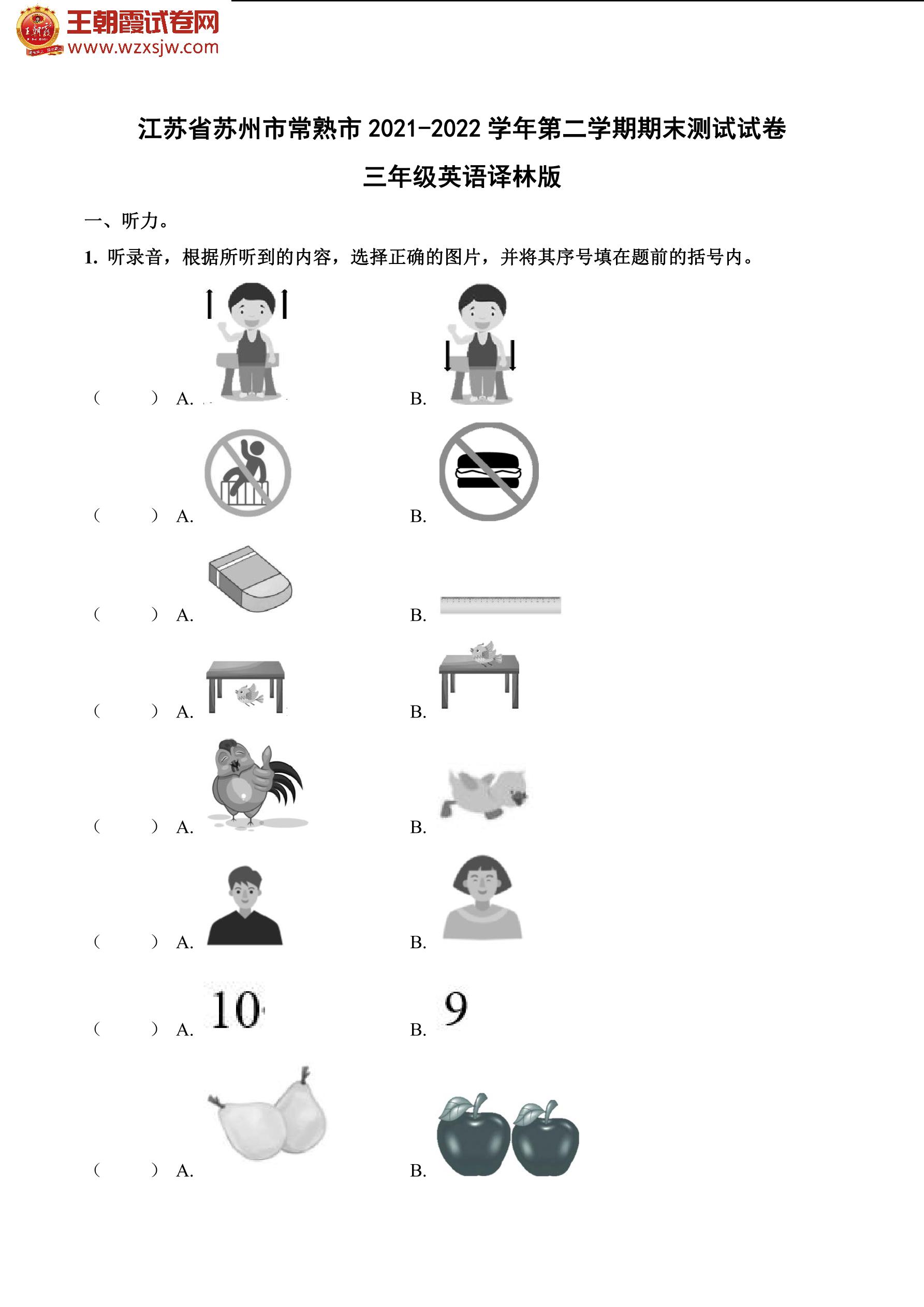江苏省苏州市常熟市2021-2022学年第二学期期末测试试卷三年级英语(译林版)(含听力音频)【无听力音频】