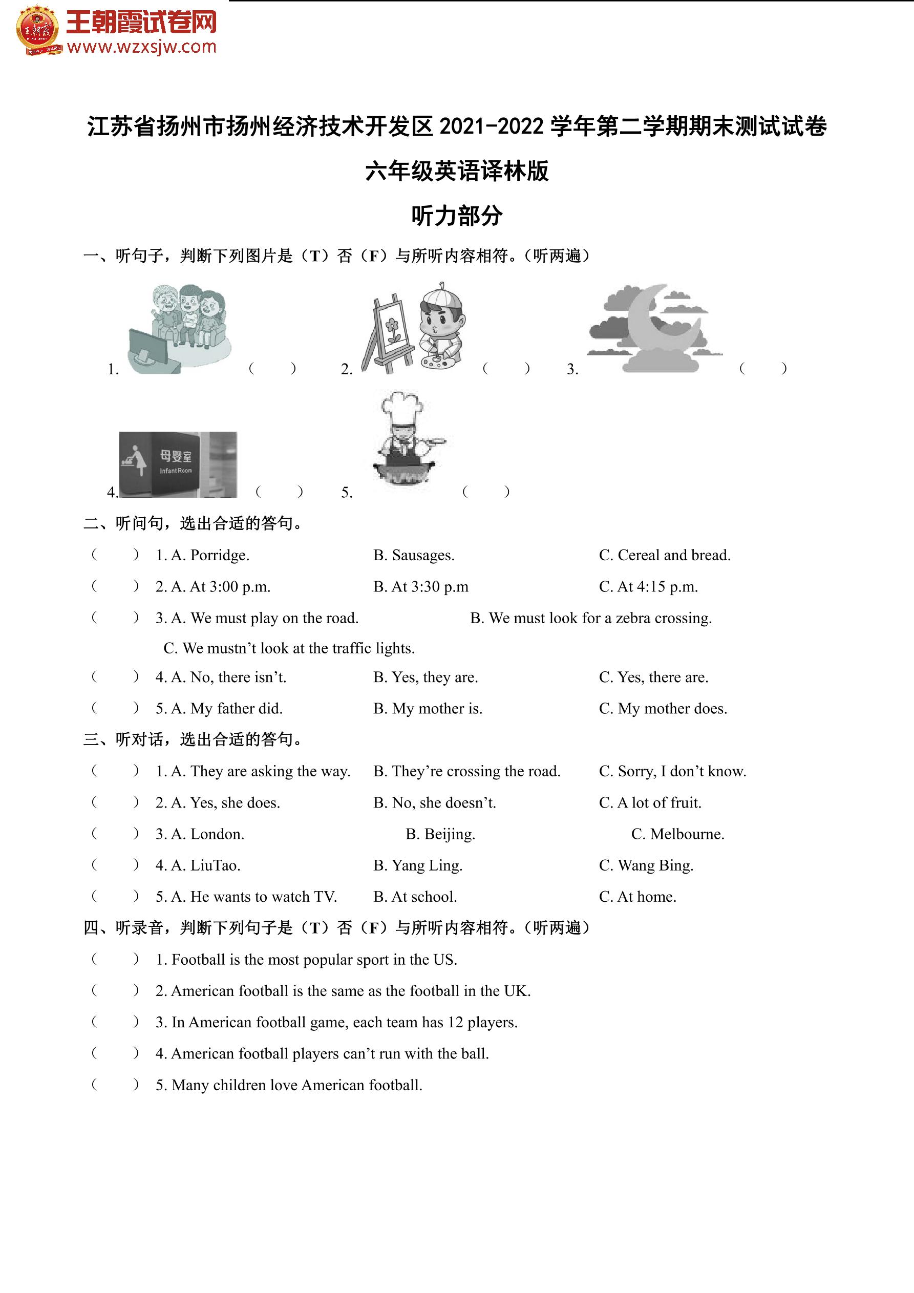 江苏省扬州市经济技术开发区2021-2022学年第二学期期末测试试卷六年级英语(译林版)(含听力音频)【无听力音频】