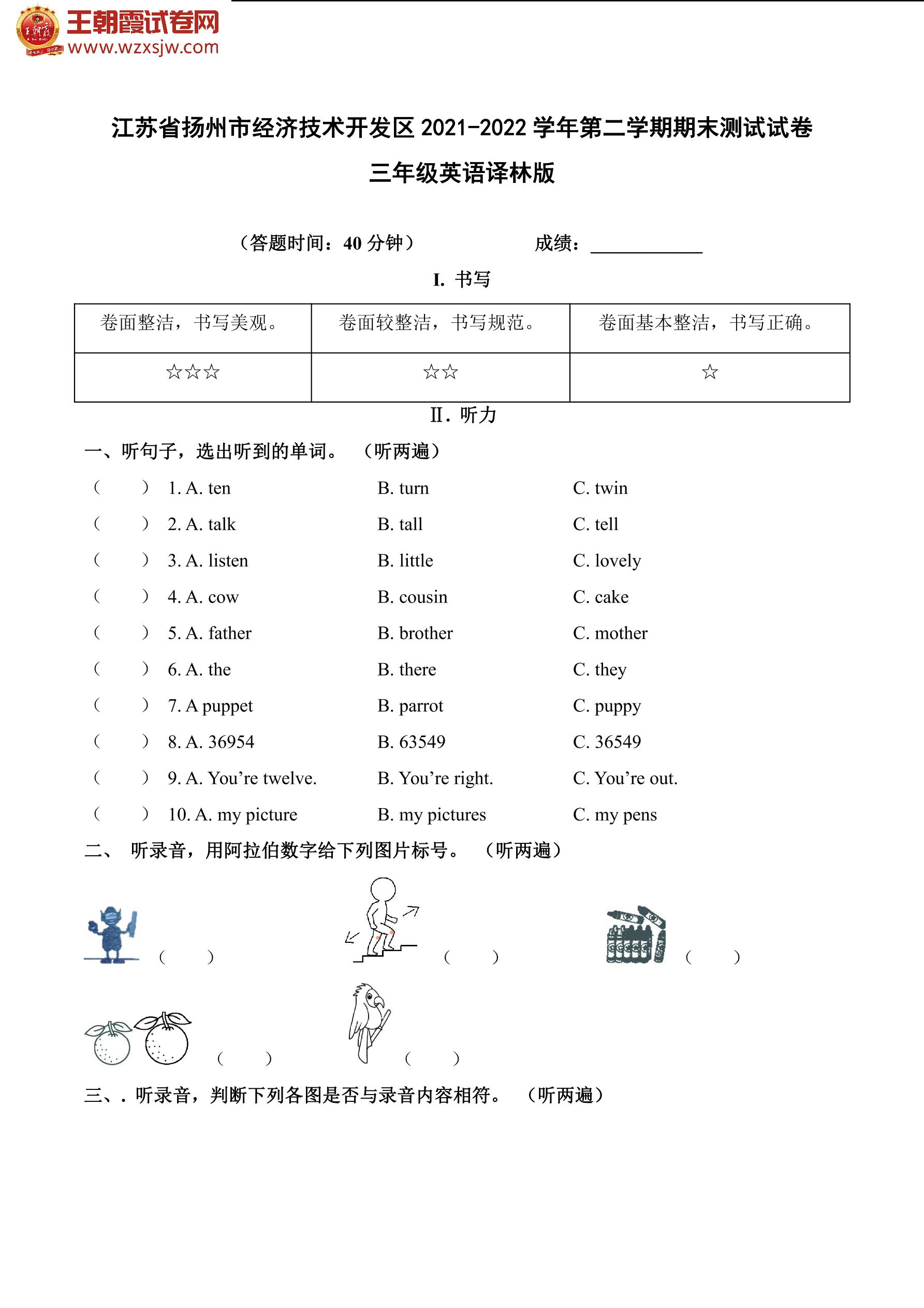 江苏省扬州市经济技术开发区2021-2022学年第二学期期末测试试卷三年级英语(译林版)(含听力音频)【无听力音频】