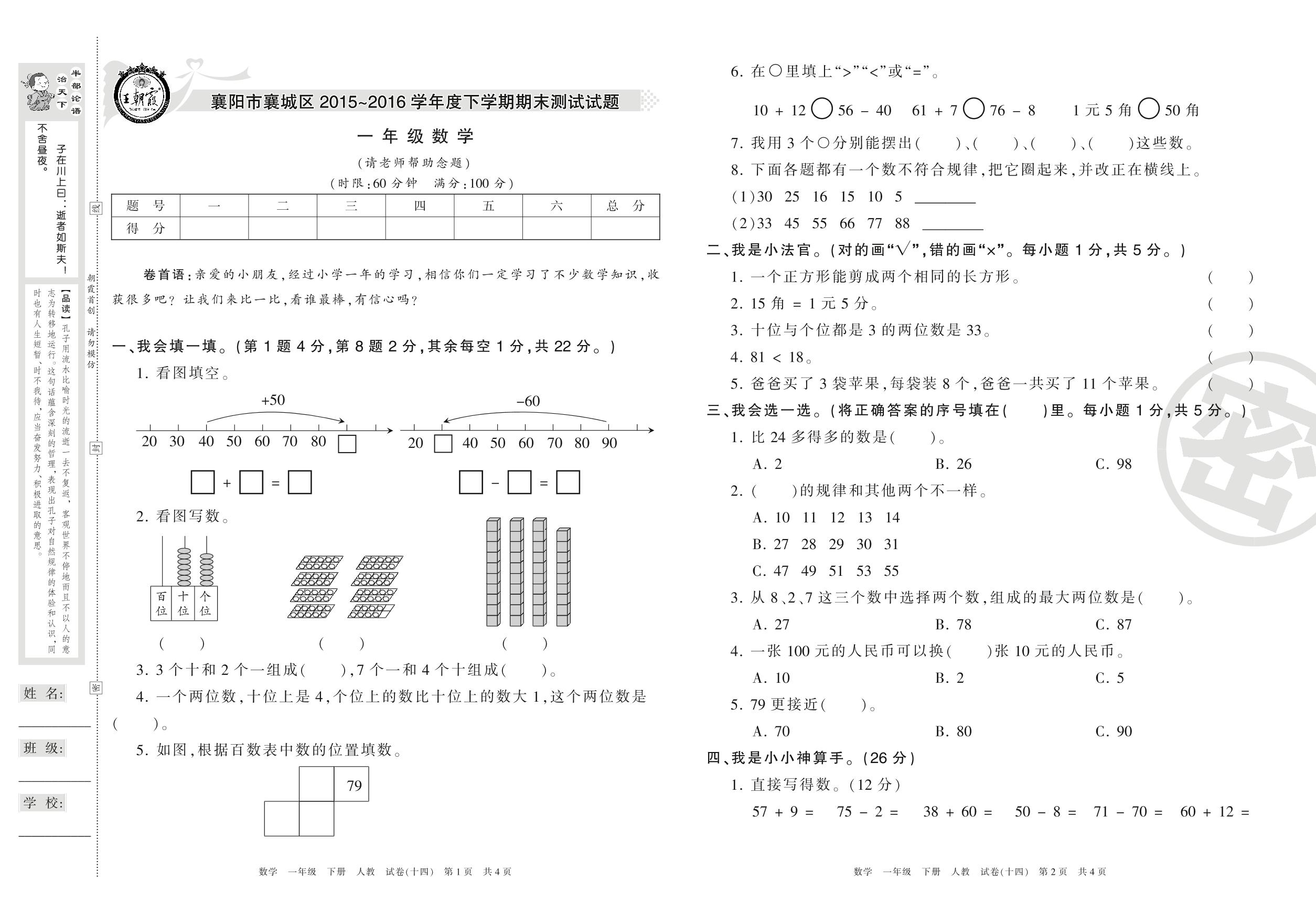 2015-2016学年第二学期襄阳市襄城区一年级数学试卷(人教版)【14】