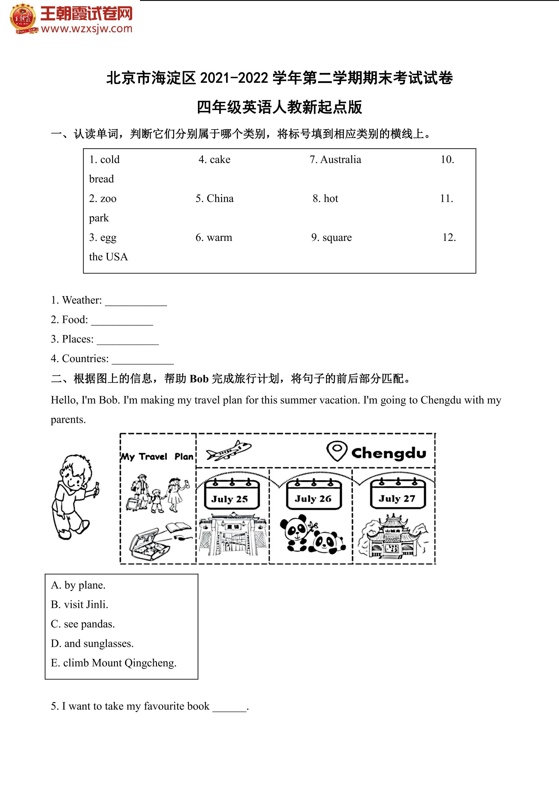 北京市海淀区2021-2022学年第二学期期末考试试卷四年级英语(人教新起点版)【无听力音频】