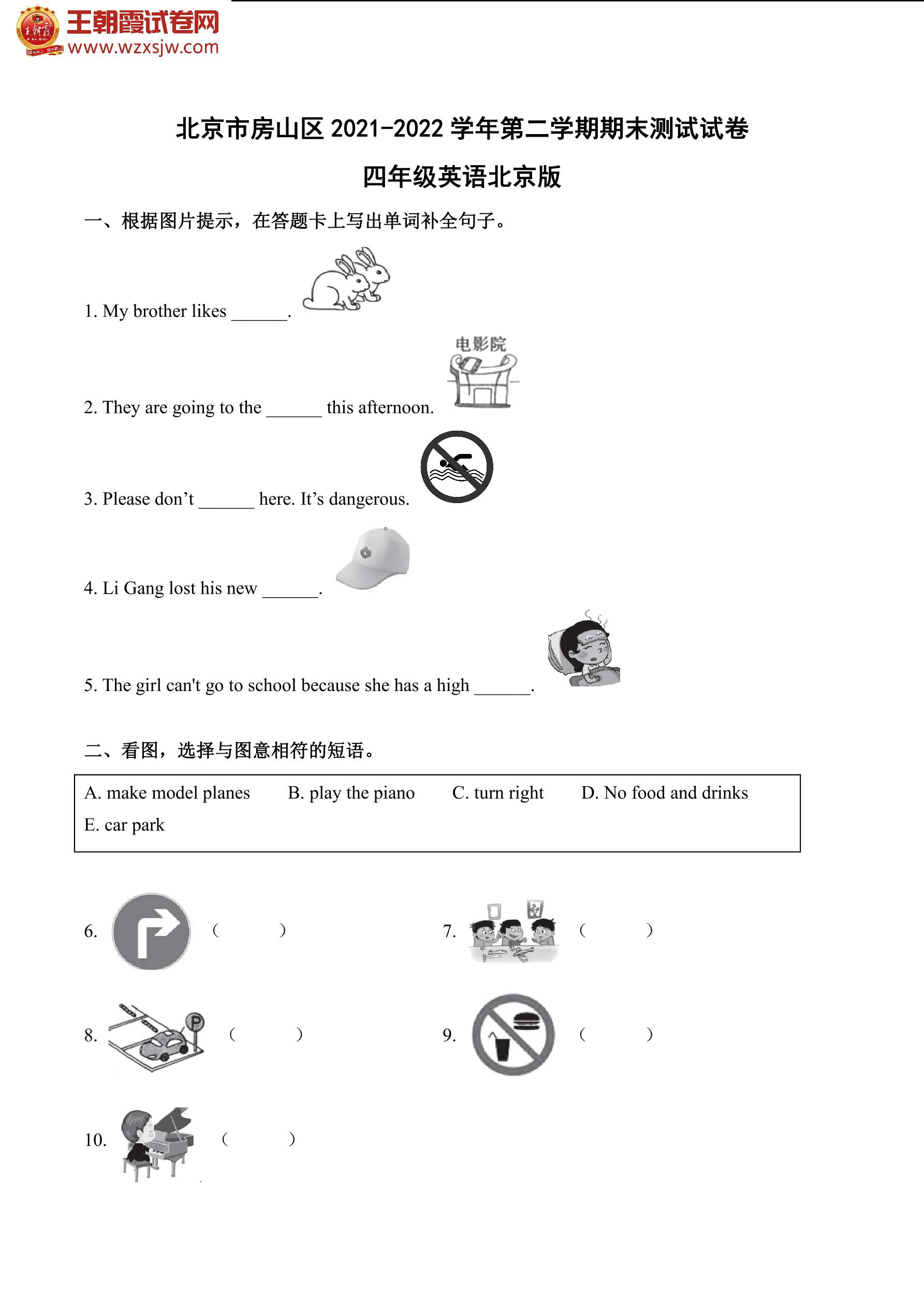 北京市房山区2021-2022学年第二学期期末测试试卷四年级英语(北京版)【无听力音频】