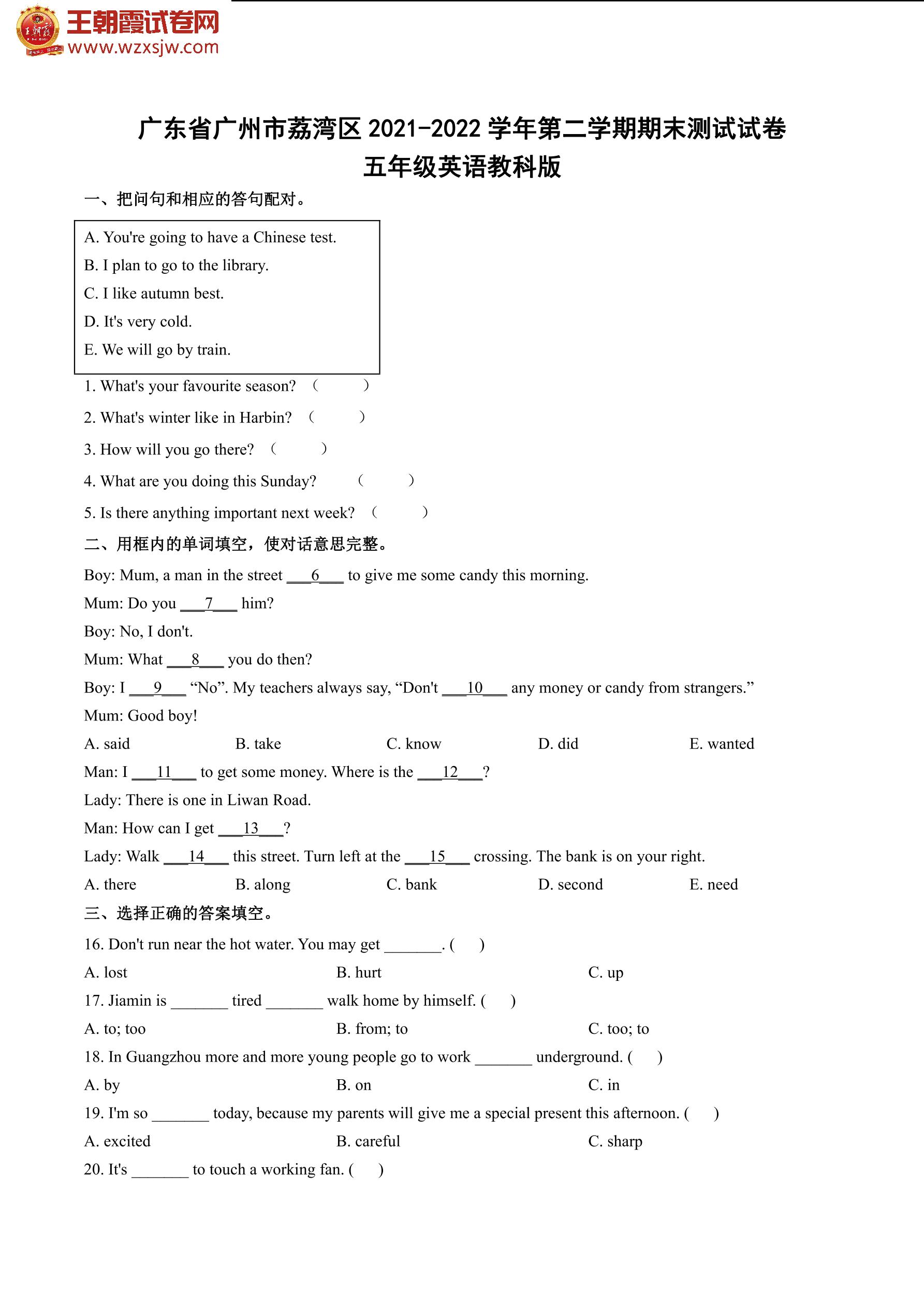 广东省广州市荔湾区2021-2022学年第二学期期末测试试卷五年级英语(教科版)(广州)【无听力音频】