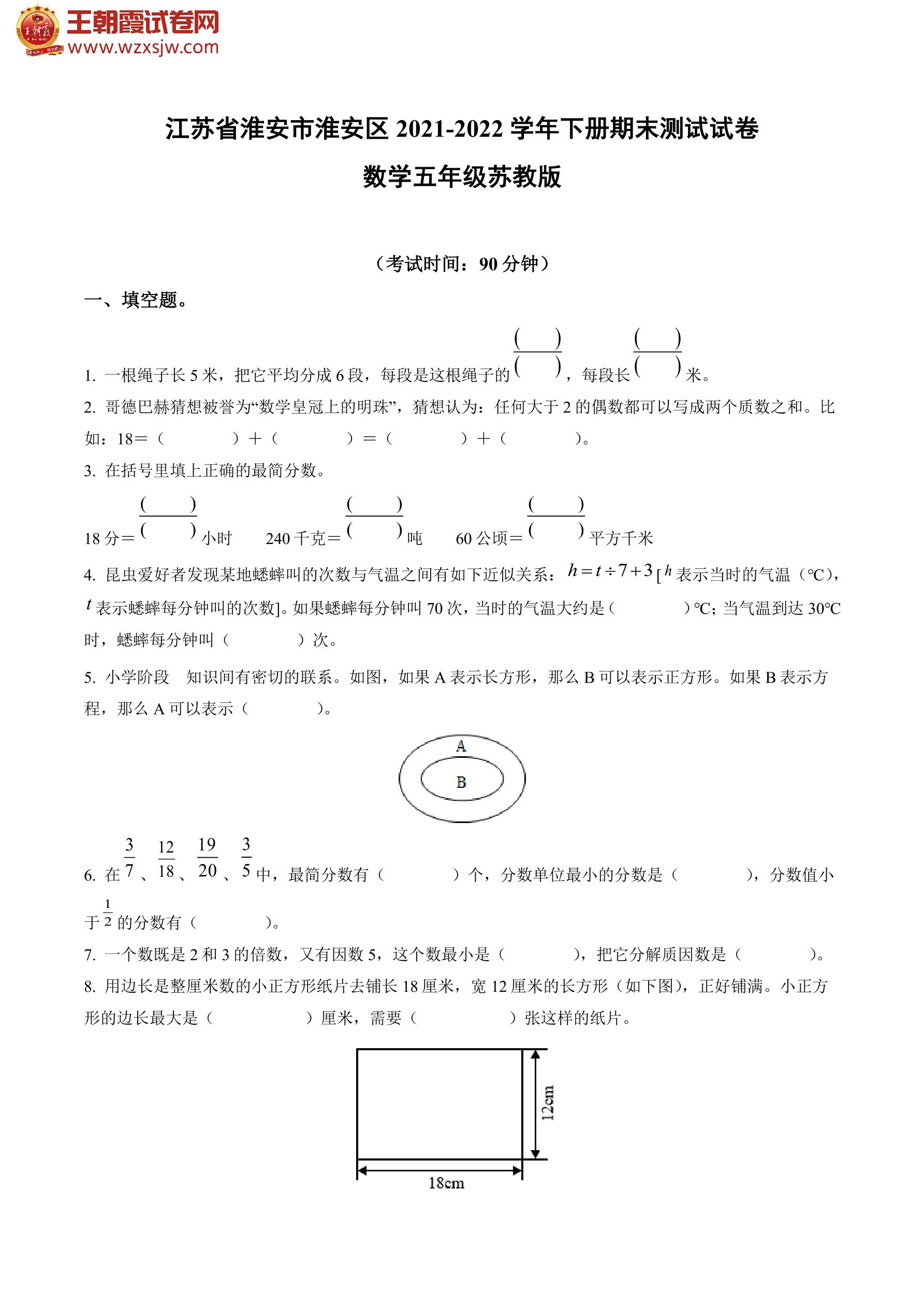 江苏省淮安市淮安区2021-2022学年下册期末测试试卷数学五年级(苏教版)