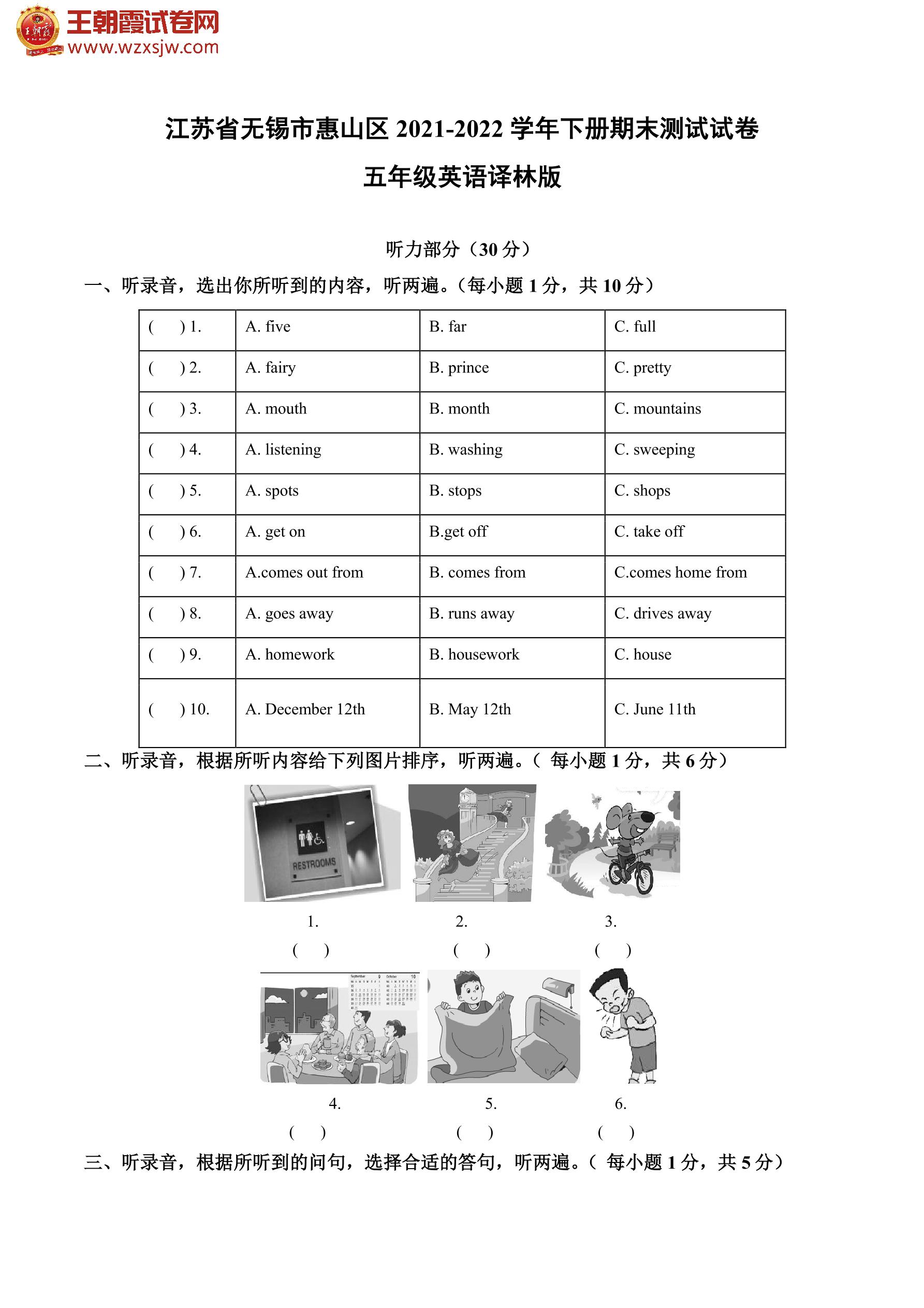 江苏省无锡市惠山区2021-2022学年下册期末测试试卷五年级英语(译林版)【无听力音频】