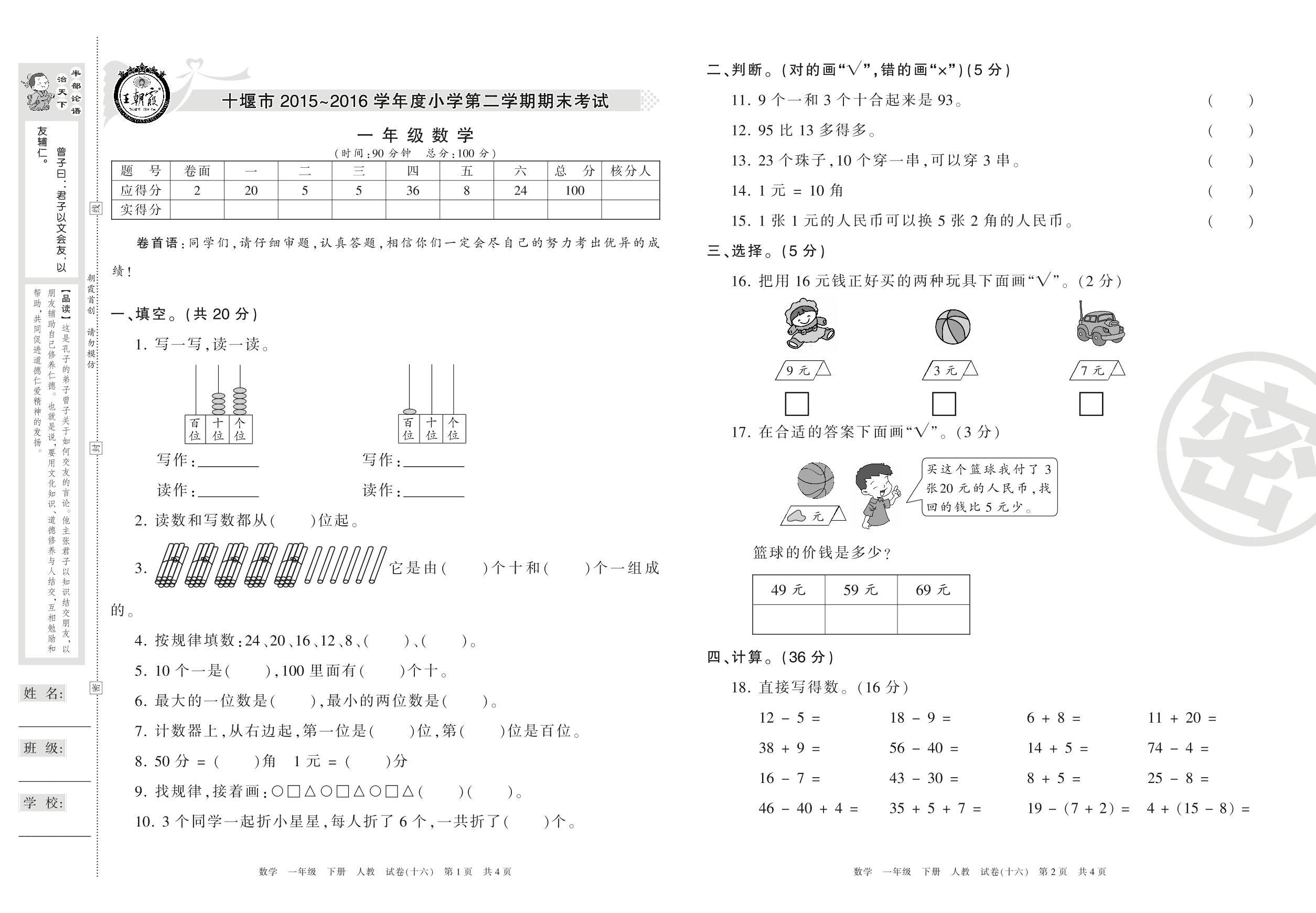 2015-2016学年第二学期十堰市一年级数学试卷(人教版)【16】