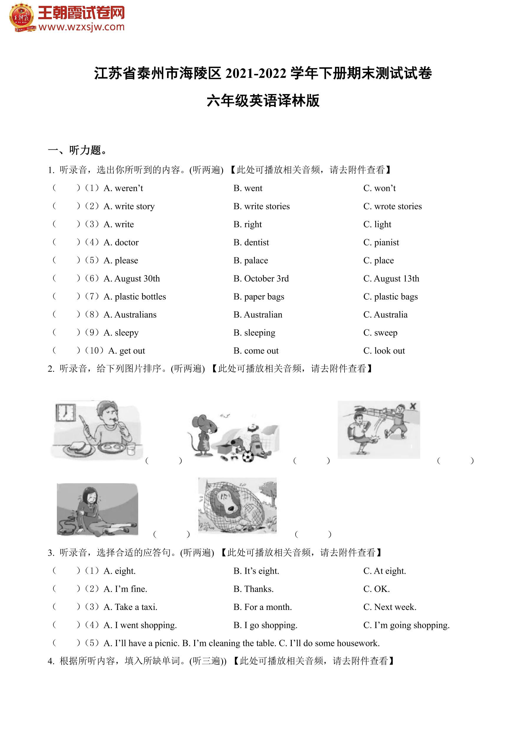 江苏省泰州市海陵区2021-2022学年下册期末测试试卷六年级英语(译林版)【无听力音频】