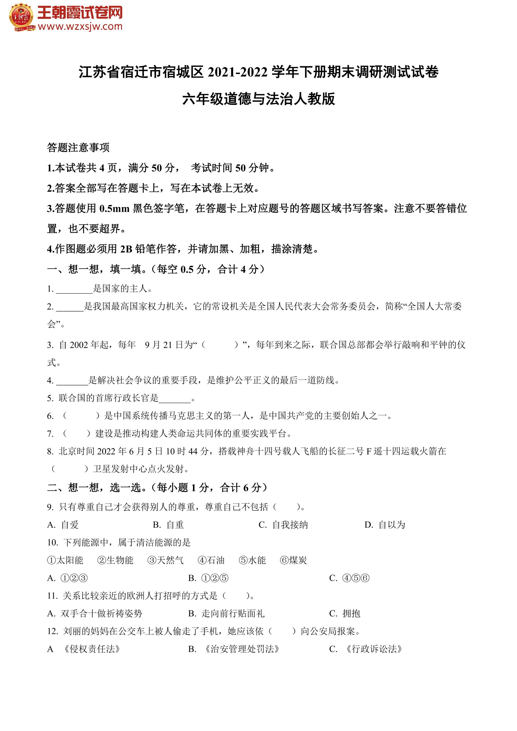 江苏省宿迁市宿城区2021-2022学年下册期末调研测试试卷六年级道德与法治(人教版)