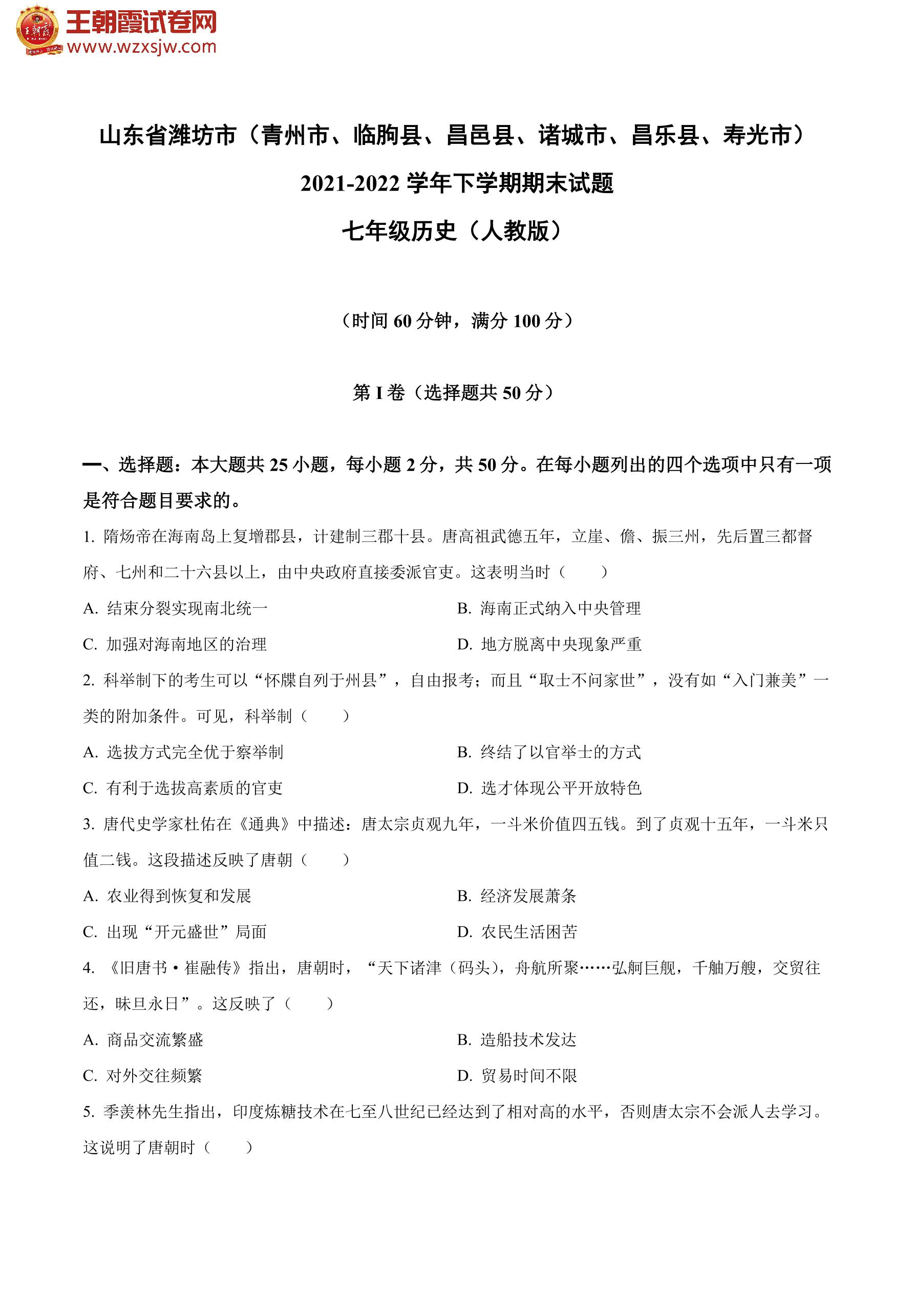 山东省潍坊市(青州市、临朐县、昌邑县、诸城市、昌乐县、寿光市)2021-2022学年下学期期末试题七年级历史(人教版)