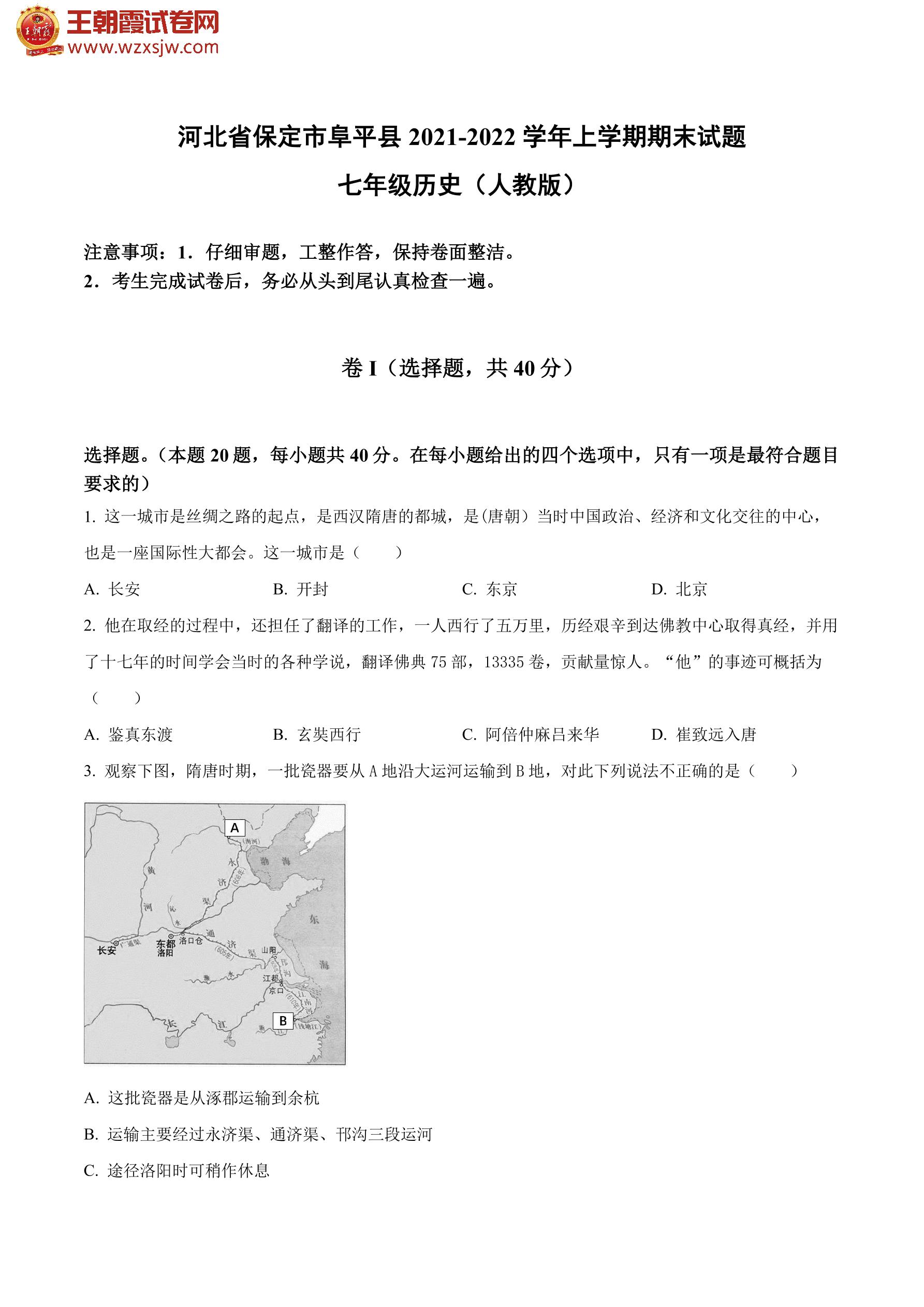 河北省保定市阜平县2021-2022学年上学期期末试题七年级历史(人教版)