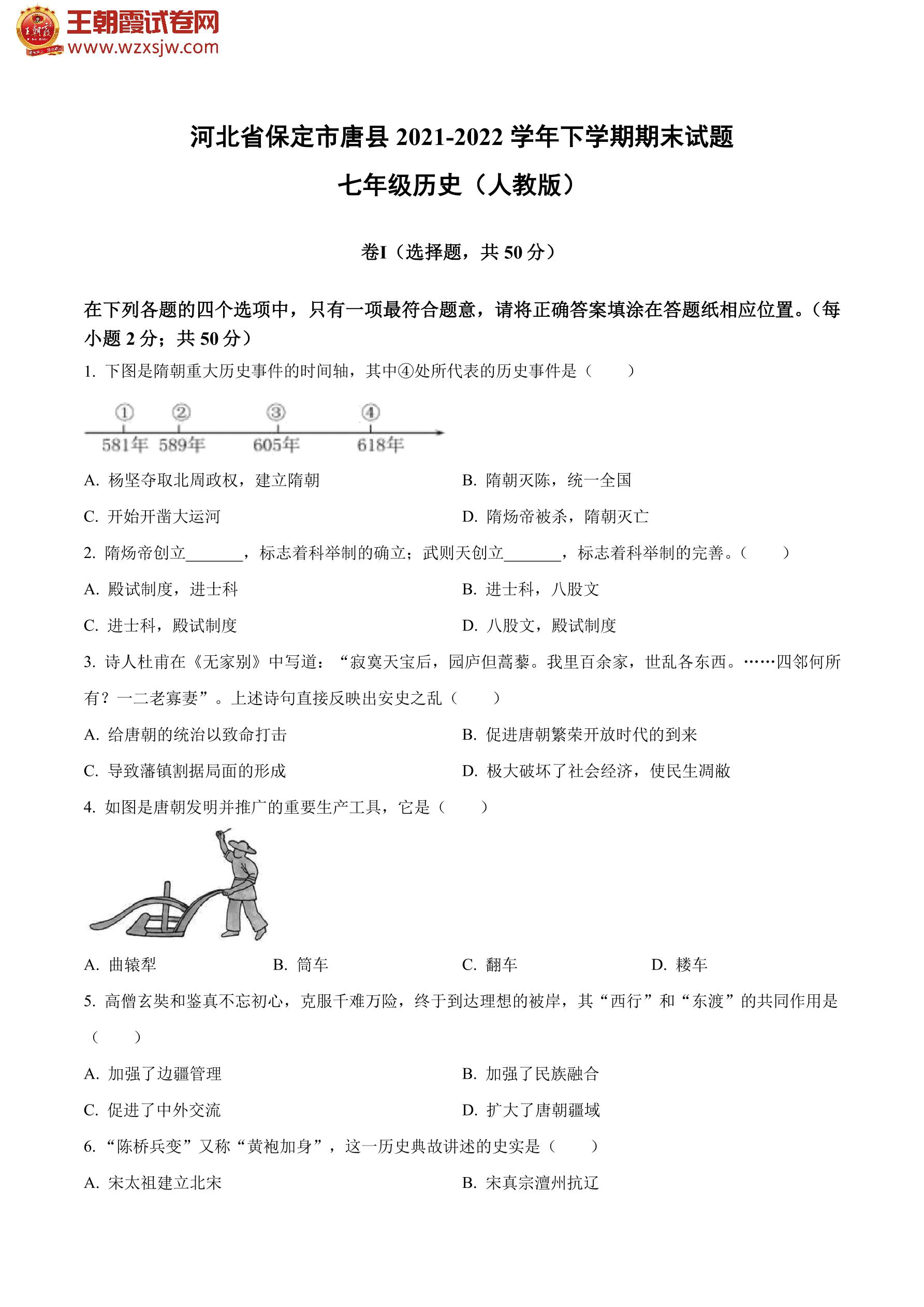 河北省保定市唐县2021-2022学年下学期期末试题七年级历史(人教版)