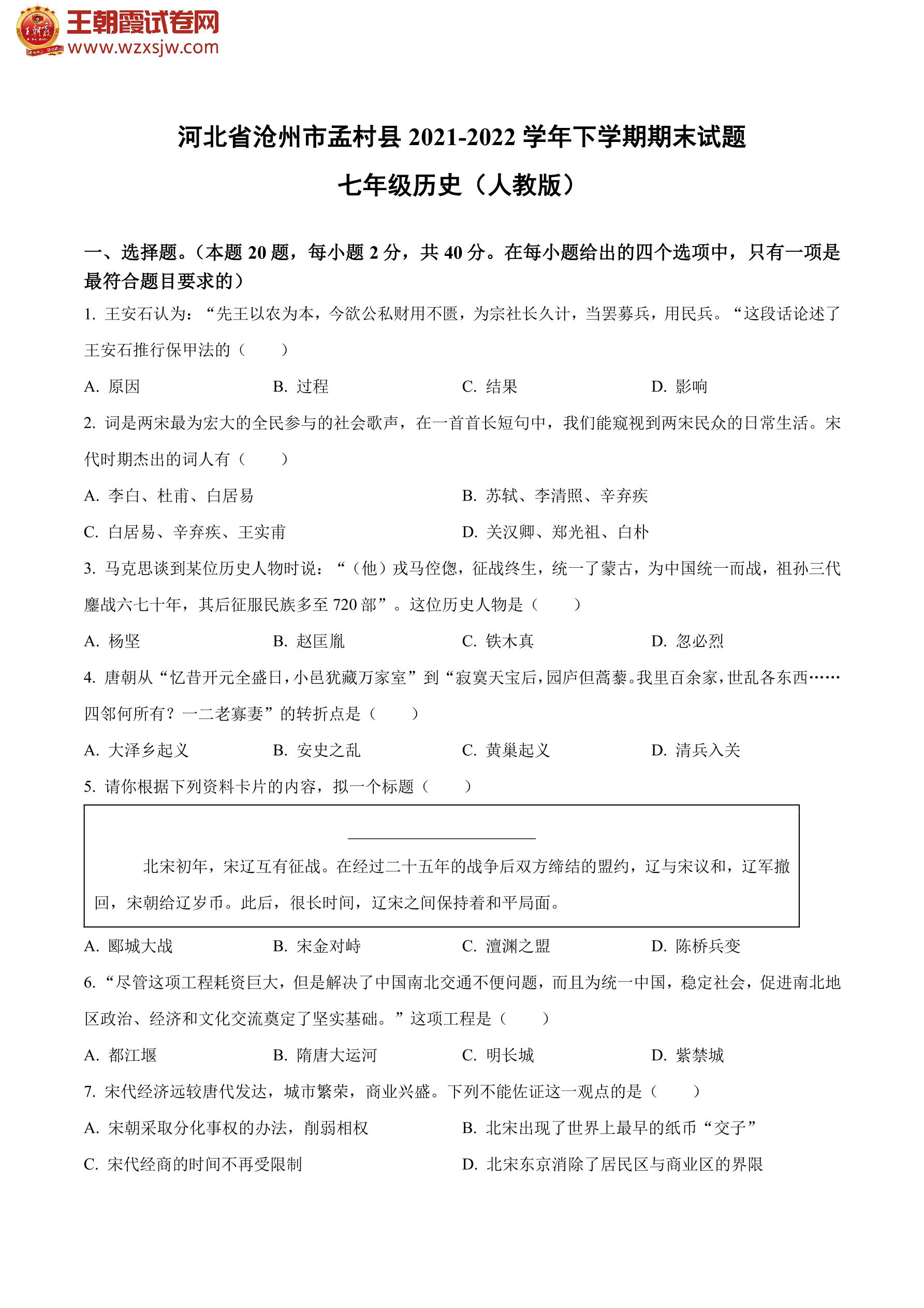 河北省沧州市孟村县2021-2022学年下学期期末试题七年级历史(人教版)