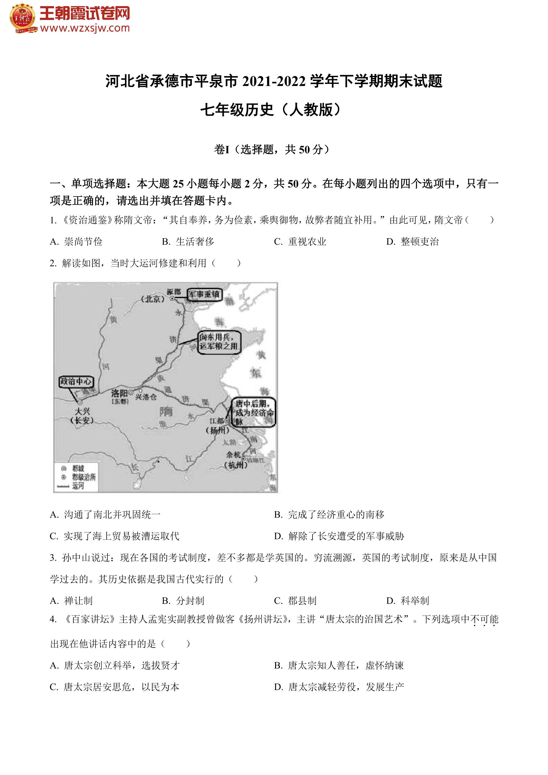 河北省承德市平泉市2021-2022学年下学期期末试题七年级历史(人教版)