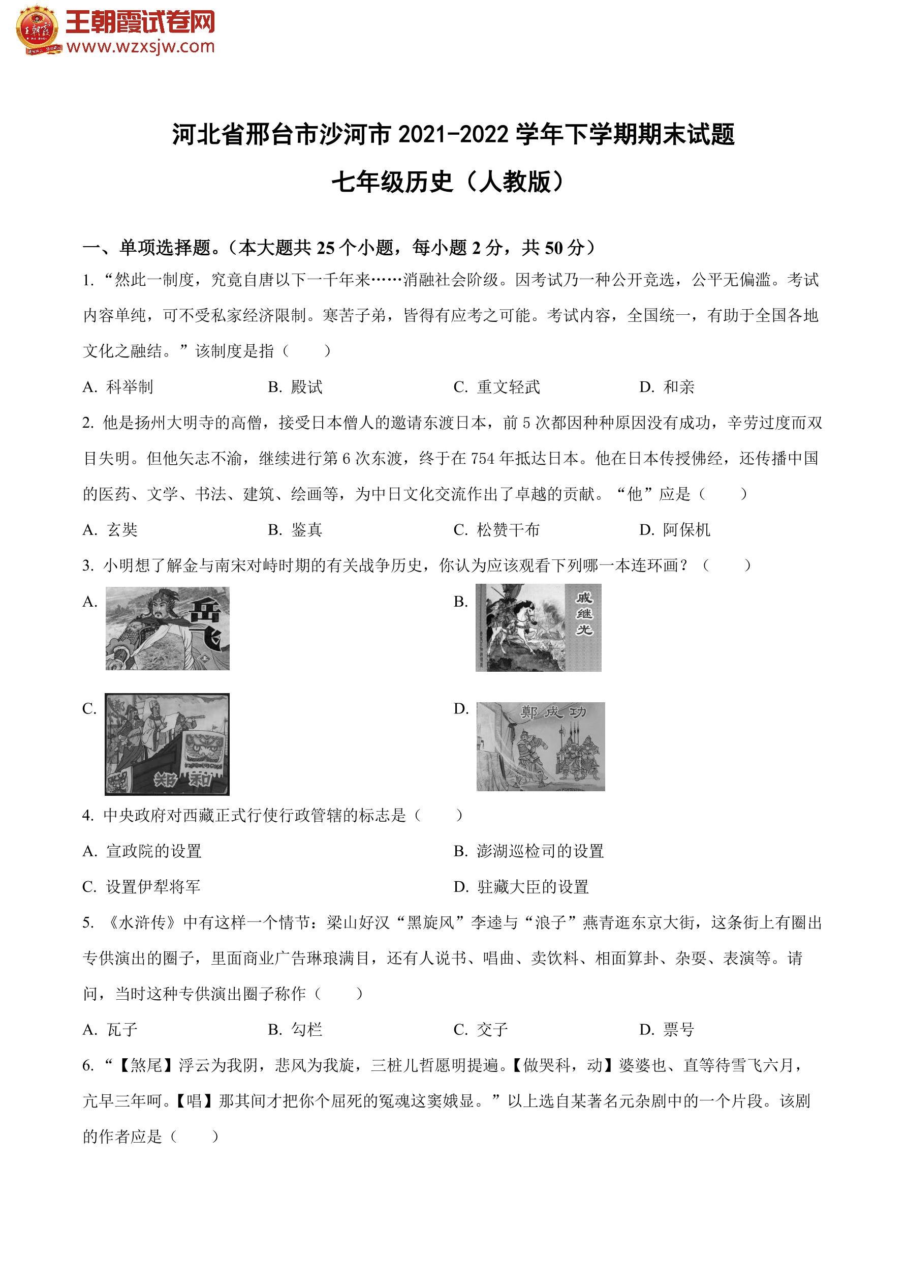 河北省邢台市沙河市2021-2022学年下学期期末试题七年级历史(人教版)