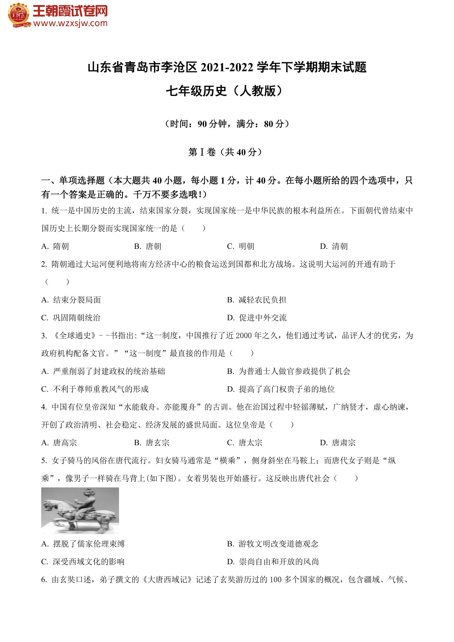 山东省青岛市李沧区2021-2022学年下学期期末试题七年级历史(人教版)