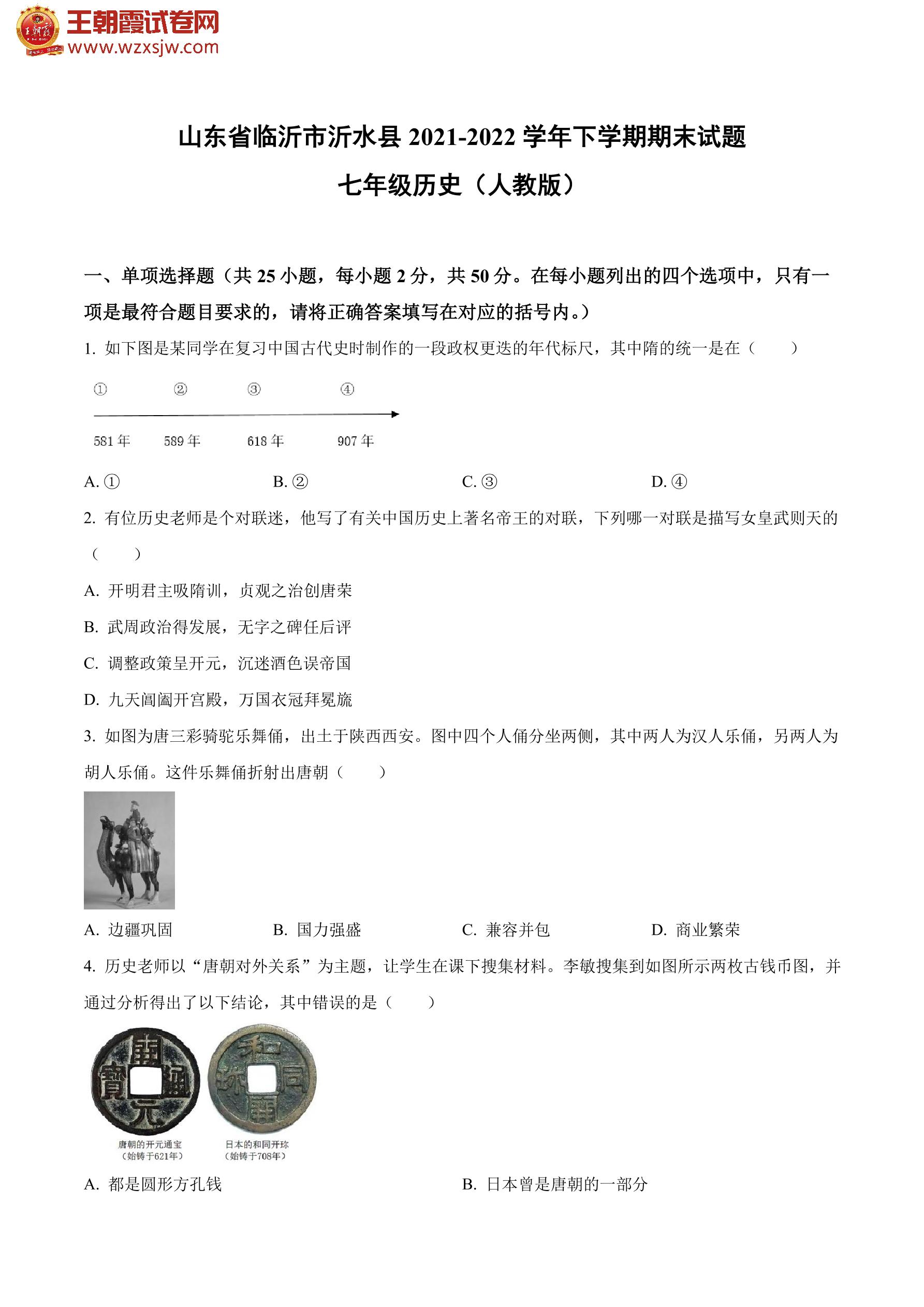 山东省临沂市沂水县2021-2022学年下学期期末试题七年级历史(人教版)