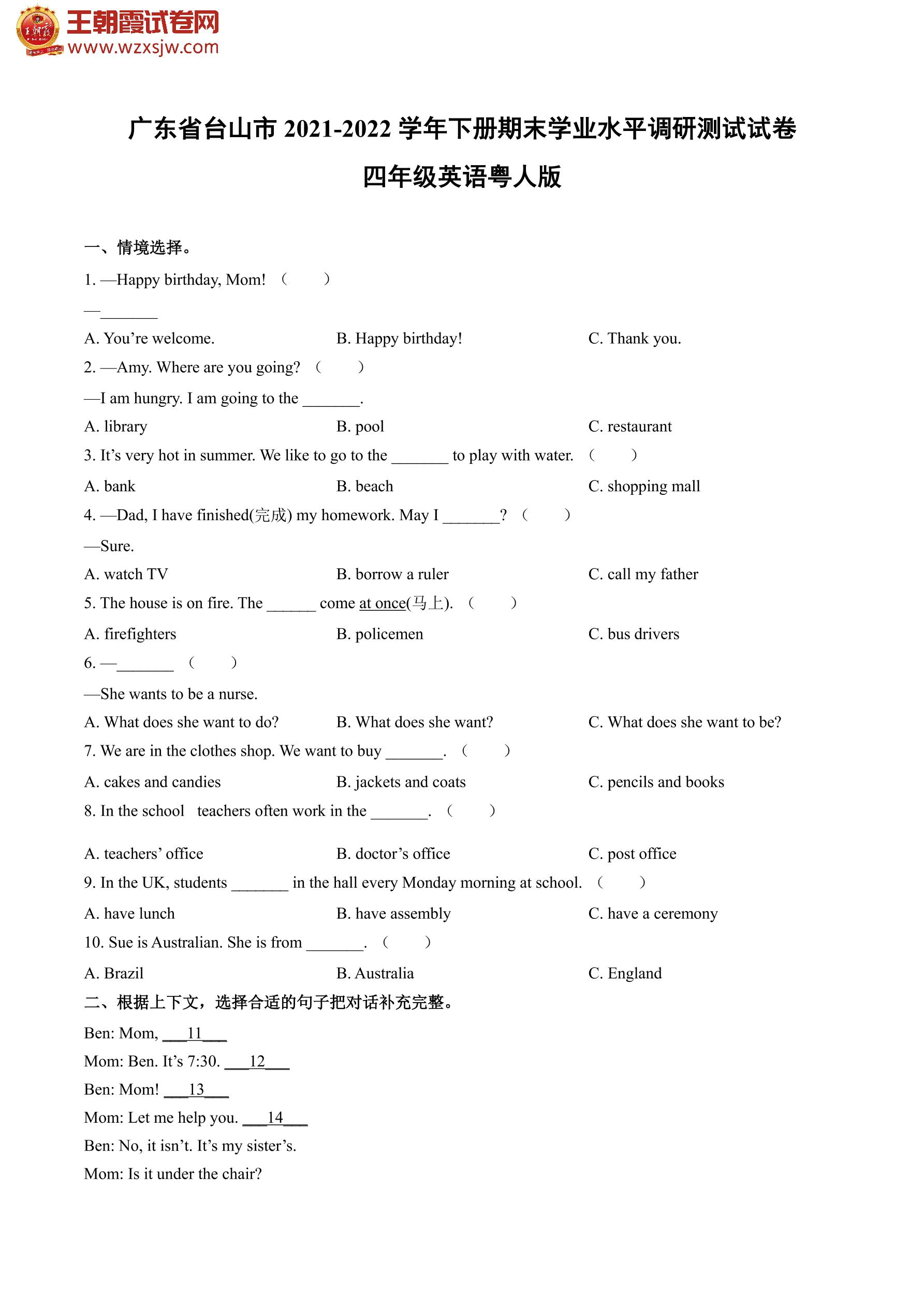 广东省台山市2021-2022学年下册期末学业水平调研测试试卷四年级英语(粤人版)【无听力音频】